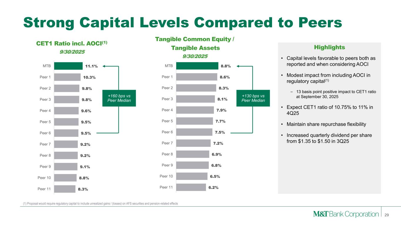 Agency MBS $19.7B US Treasury $7.1B Agency CMBS $6.9B Municipal Bonds $2.2B Equity & Other $1.0B High Quality Securities Portfolio (1) Mortgage securities include estimated prepayment under market forward interest rates $37B Securities Portfolio Composition 9/30/2025 • Securities of $36.9B; 17% of total assets • ~$0.9B securities maturing(1) in remainder of 2025 with an average yield of 4.0% • Investment securities yield increased to 4.13% in 3Q25 • AFS and pension-related AOCI would have impacted the CET1 capital ratio by +13 bps at the end of 3Q25 • HTM debt securities represent 34% of securities • Agency MBS/CMBS and U.S. Treasurys represent ~91% of securities portfolio Duration Pretax Unrealized Gain/(Loss) AFS ~2.5 years $163 million HTM ~5.4 years ($789 million) Total Debt Securities ~3.5 years ($626 million) Highlights 28