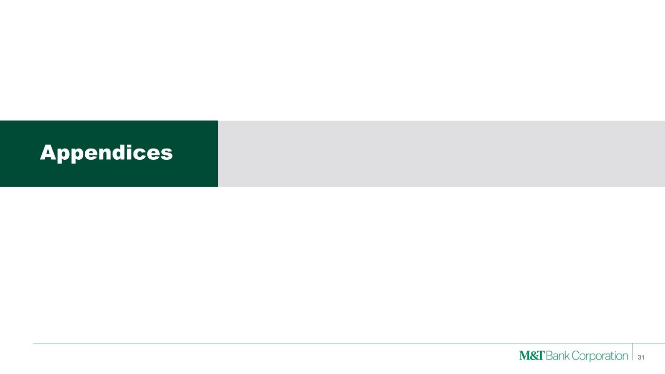 8.3% 8.8% 9.1% 9.2% 9.2% 9.5% 9.5% 9.6% 9.8% 9.8% 10.3% 11.1% Peer 11 Peer 10 Peer 9 Peer 8 Peer 7 Peer 6 Peer 5 Peer 4 Peer 3 Peer 2 Peer 1 MTB 6.2% 6.5% 6.8% 6.9% 7.2% 7.5% 7.7% 7.9% 8.1% 8.3% 8.6% 8.8% Peer 11 Peer 10 Peer 9 Peer 8 Peer 7 Peer 6 Peer 5 Peer 4 Peer 3 Peer 2 Peer 1 MTB Strong Capital Levels Compared to Peers • Capital levels favorable to peers both as reported and when considering AOCI • Modest impact from including AOCI in regulatory capital(1) – 13 basis point positive impact to CET1 ratio at September 30, 2025 • Expect CET1 ratio of 10.75% to 11% in 4Q25 • Maintain share repurchase flexibility • Increased quarterly dividend per share from $1.35 to $1.50 in 3Q25 (1) Proposal would require regulatory capital to include unrealized gains / (losses) on AFS securities and pension-related effects CET1 Ratio incl. AOCI(1) 9/30/2025 Tangible Common Equity / Tangible Assets 9/30/2025 Highlights 29 +160 bps vs Peer Median +130 bps vs Peer Median