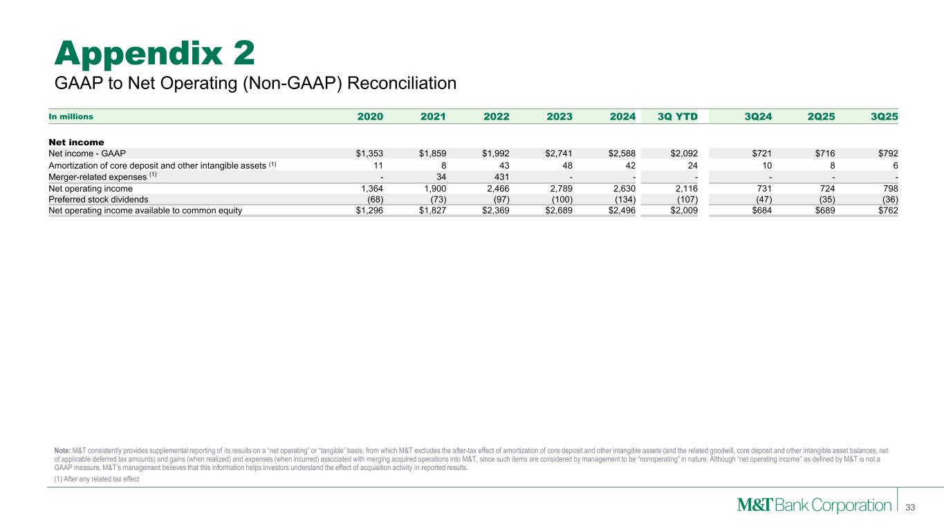 Appendix 1 Note: M&T is providing supplemental reporting of its results on a “GAAP – Adjusted” basis, from which M&T excludes the after-tax effect of certain notable items of significance. Although “GAAP – Adjusted” income as presented by M&T is not a GAAP measure, M&T’s management believes that this information helps investors understand the effect of such notable items in reported results. Tables in appendices may not foot due to rounding. GAAP to GAAP - Adjusted (Non-GAAP) Reconciliation 32 In millions 2020 2021 2022 2023 2024 3Q YTD 3Q24 2Q25 3Q25 Revenues Net interest income - GAAP $3,866 $3,825 $5,822 $7,115 $6,852 $5,169 $1,726 $1,713 $1,761 Total other income - GAAP 2,088 2,167 2,357 2,528 2,427 2,046 606 683 752 Subtotal 5,955 5,992 8,179 9,643 9,279 7,215 2,332 2,396 2,513 Premium amortization for acquired securities - - - - - 17 - 17 - Gain on sale of out-of-footprint loan portfolio - - - - - (15) - (15) - Gain on sale of ICS subsidiary - - - - - (10) - (10) - Gain & earnout on CIT - - - (225) - (28) - - (28) Gain on MTIA - - (136) - - - - - - Revenues - GAAP Adjusted $5,955 $5,992 $8,042 $9,418 $9,279 $7,179 $2,332 $2,388 $2,485 Noninterest expense Noninterest expense - GAAP $3,385 $3,612 $5,050 $5,379 $5,359 $4,114 $1,303 $1,336 $1,363 Pension plan distribution benefit - - - - 12 - - - - Redemption of trust preferred obligations - - - - (20) - - - - Vacated facility write-downs - - - - (27) - - - - FDIC special assessment - - - (197) (34) - - - - Charitable contribution - - (135) - - - - - - Merger-related expense - (44) (338) - - - - - - Noninterest expense - GAAP Adjusted $3,385 $3,568 $4,577 $5,182 $5,290 $4,114 $1,303 $1,336 $1,363 PPNR Revenues - GAAP Adjusted $5,955 $5,992 $8,042 $9,418 $9,279 $7,179 $2,332 $2,388 $2,485 (Gain) loss on bank investment securities 9 21 6 (4) (10) (1) 2 - (1) Noninterest expense - GAAP Adjusted (3,385) (3,568) (4,577) (5,182) (5,290) (4,114) (1,303) (1,336) (1,363) Pre-provision net revenue $2,579 $2,445 $3,471 $4,232 $3,979 $3,064 $1,031 $1,052 $1,121