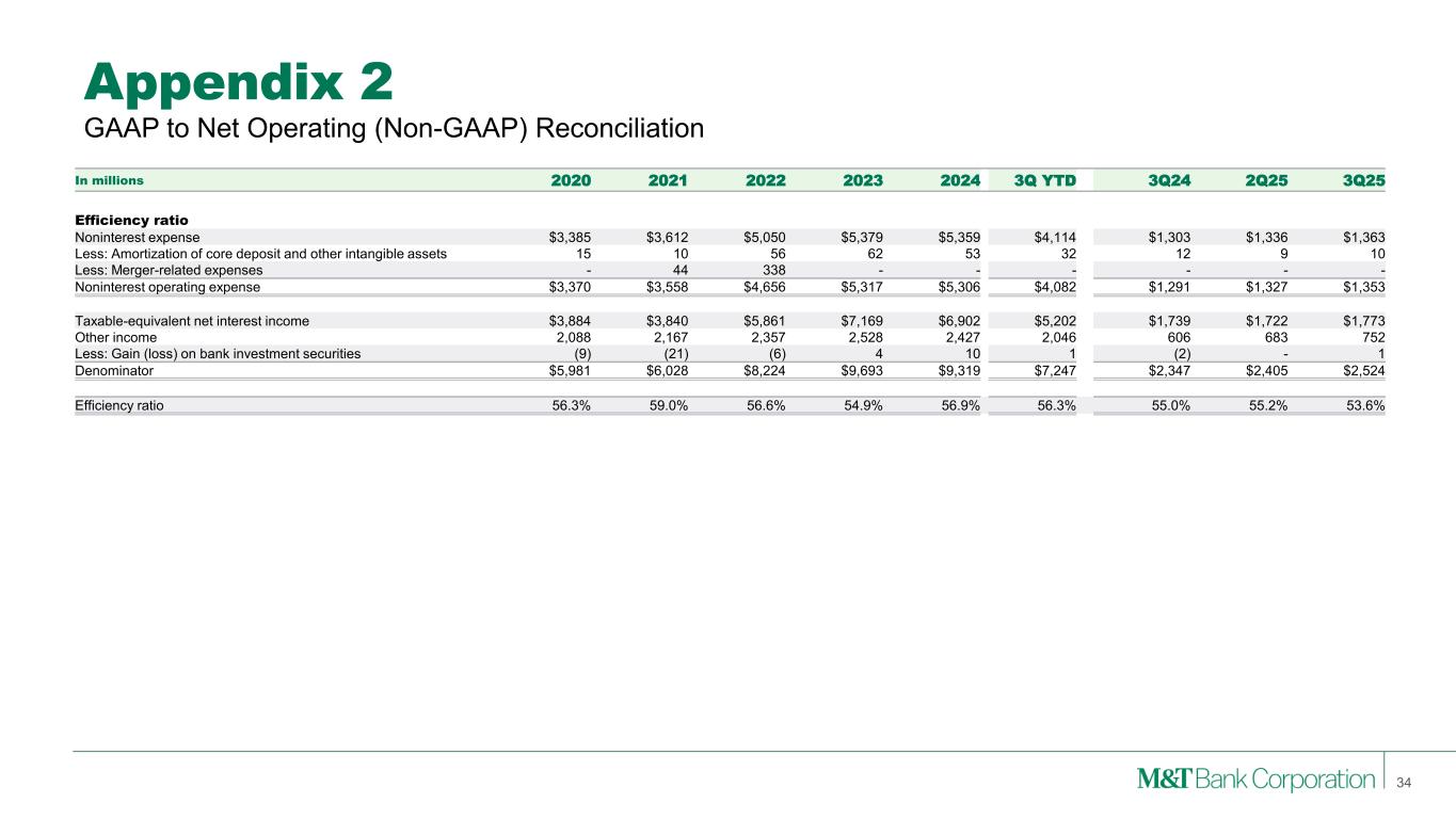 Appendix 2 Note: M&T consistently provides supplemental reporting of its results on a “net operating” or “tangible” basis, from which M&T excludes the after-tax effect of amortization of core deposit and other intangible assets (and the related goodwill, core deposit and other intangible asset balances, net of applicable deferred tax amounts) and gains (when realized) and expenses (when incurred) associated with merging acquired operations into M&T, since such items are considered by management to be “nonoperating” in nature. Although “net operating income” as defined by M&T is not a GAAP measure, M&T’s management believes that this information helps investors understand the effect of acquisition activity in reported results. (1) After any related tax effect 33 GAAP to Net Operating (Non-GAAP) Reconciliation In millions 2020 2021 2022 2023 2024 3Q YTD 3Q24 2Q25 3Q25 Net income Net income - GAAP $1,353 $1,859 $1,992 $2,741 $2,588 $2,092 $721 $716 $792 Amortization of core deposit and other intangible assets (1) 11 8 43 48 42 24 10 8 6 Merger-related expenses (1) - 34 431 - - - - - - Net operating income 1,364 1,900 2,466 2,789 2,630 2,116 731 724 798 Preferred stock dividends (68) (73) (97) (100) (134) (107) (47) (35) (36) Net operating income available to common equity $1,296 $1,827 $2,369 $2,689 $2,496 $2,009 $684 $689 $762