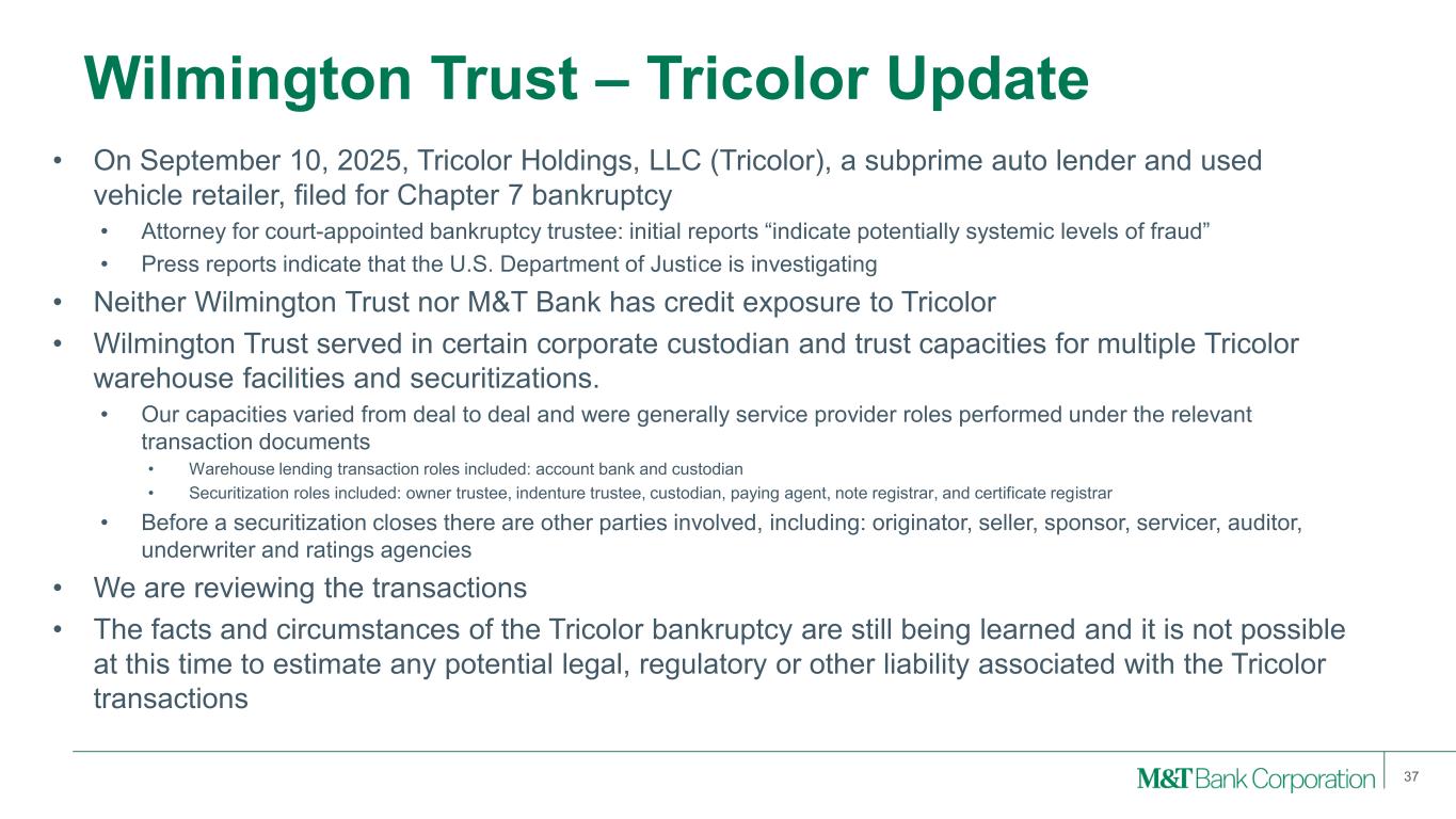 Wilmington Trust – Tricolor Update 37 Build our New England ad Long Island Markets Make our Systems and Processes Resilient and Scalable Continue to Develop and Scale our Capability to Manage Risk • On September 10, 2025, Tricolor Holdings, LLC (Tricolor), a subprime auto lender and used vehicle retailer, filed for Chapter 7 bankruptcy • Attorney for court-appointed bankruptcy trustee: initial reports “indicate potentially systemic levels of fraud” • Press reports indicate that the U.S. Department of Justice is investigating • Neither Wilmington Trust nor M&T Bank has credit exposure to Tricolor • Wilmington Trust served in certain corporate custodian and trust capacities for multiple Tricolor warehouse facilities and securitizations. • Our capacities varied from deal to deal and were generally service provider roles performed under the relevant transaction documents • Warehouse lending transaction roles included: account bank and custodian • Securitization roles included: owner trustee, indenture trustee, custodian, paying agent, note registrar, and certificate registrar • Before a securitization closes there are other parties involved, including: originator, seller, sponsor, servicer, auditor, underwriter and ratings agencies • We are reviewing the transactions • The facts and circumstances of the Tricolor bankruptcy are still being learned and it is not possible at this time to estimate any potential legal, regulatory or other liability associated with the Tricolor transactions
