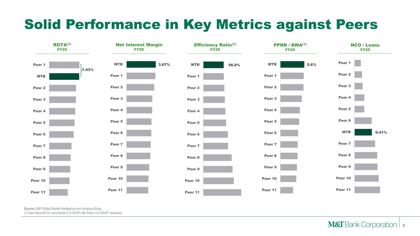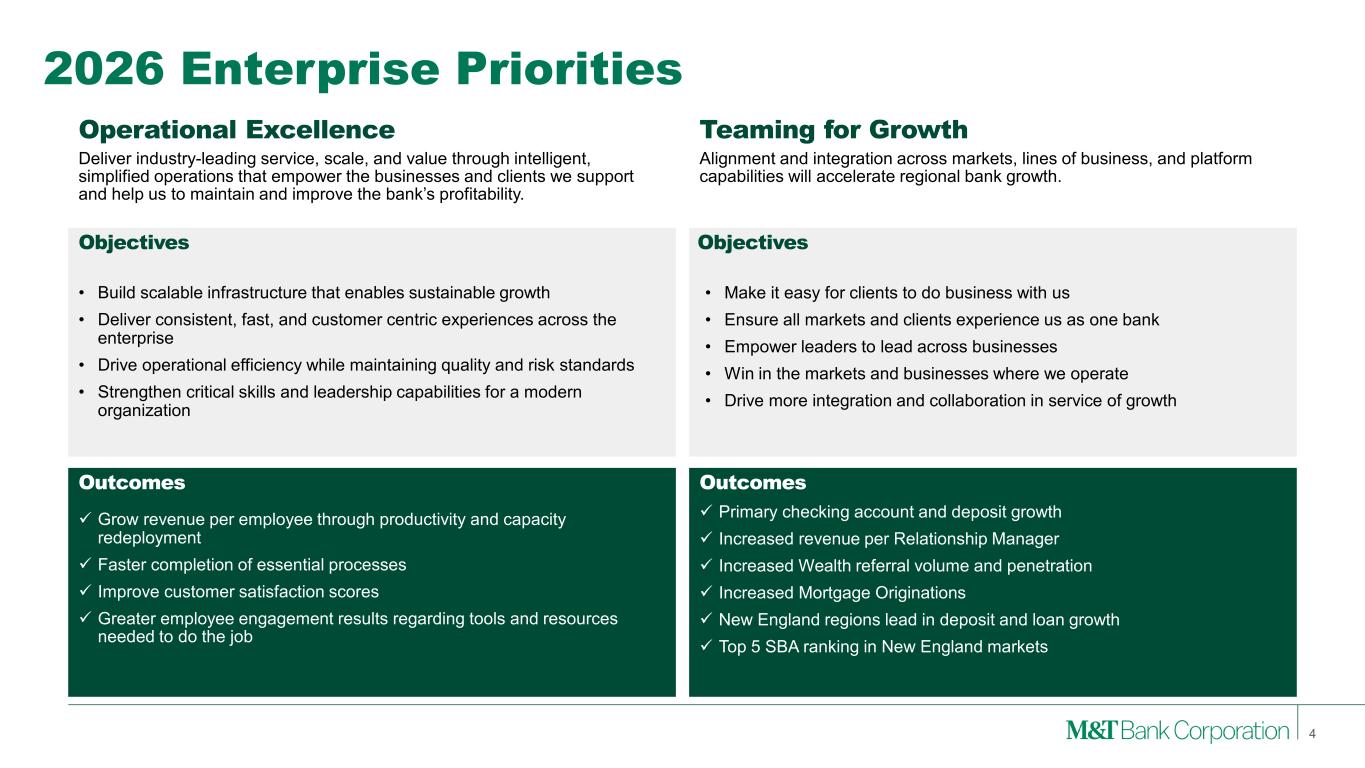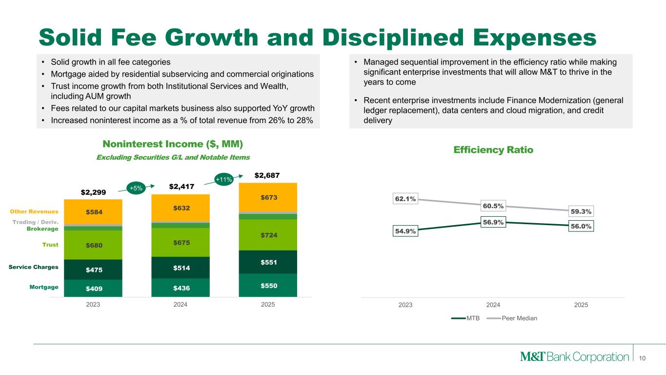 Forward-Looking Statements and Non-GAAP Financial Measures This presentation may contain forward-looking statements regarding M&T Bank Corporation (“M&T”) within the meaning of the Private Securities Litigation Reform Act of 1995 and the rules and regulations of the Securities and Exchange Commission (“SEC”). Any statement that does not describe historical or current facts is a forward-looking statement, including statements based on current expectations, estimates and projections about M&T's business, and management's beliefs and assumptions. Statements regarding the potential effects of events or factors specific to M&T and/or the financial industry as a whole, as well as national and global events generally, on M&T's business, financial condition, liquidity and results of operations may constitute forward-looking statements. Such statements are subject to the risk that the actual effects may differ, possibly materially, from what is reflected in those forward-looking statements due to factors and future developments that are uncertain, unpredictable and in many cases beyond M&T's control. Forward-looking statements are typically identified by words such as "believe," "expect," "anticipate," "intend," "target," "estimate," "continue," or "potential," by future conditional verbs such as "will," "would," "should," "could," or "may," or by variations of such words or by similar expressions. These statements are not guarantees of future performance and involve certain risks, uncertainties and assumptions which are difficult to predict and may cause actual outcomes to differ materially from what is expressed or forecasted. While there can be no assurance that any list of risks and uncertainties is complete, important factors that could cause actual outcomes and results to differ materially from those contemplated by forward-looking statements include the following, without limitation: economic conditions and growth rates, including inflation and market volatility; events, developments and current conditions in the financial services industry, including trust, brokerage and investment management businesses; changes in interest rates, spreads on earning assets and interest-bearing liabilities, and interest rate sensitivity; prepayment speeds, loan originations, loan concentrations by type and industry, credit losses and market values on loans, collateral securing loans, and other assets; sources of liquidity; levels of client deposits; ability to contain costs and expenses; changes in M&T's credit ratings; domestic or international political developments and other geopolitical events, including trade and tariff policies and international conflicts and hostilities; changes and trends in the securities markets; common shares outstanding and common stock price volatility; fair value of and number of stock-based compensation awards to be issued in future periods; the impact of changes in market values on trust-, brokerage-, and investment management-related revenues; federal, state or local legislation and/or regulations affecting the financial services industry, or M&T and its subsidiaries individually or collectively, including tax policy; regulatory supervision and oversight, including monetary policy and capital requirements; governmental and public policy changes; political conditions, either nationally or in the states in which M&T and its subsidiaries do business; the initiation and outcome of potential, pending and future litigation, investigations and governmental proceedings, including tax-related examinations and other matters; operational risk events, including loss resulting from fraud by employees or persons outside M&T and breaches in data and cybersecurity; changes in accounting policies or procedures as may be required by the Financial Accounting Standards Board, regulatory agencies or legislation; increasing price, product and service competition by competitors, including new entrants; technological developments and changes; the ability to continue to introduce competitive new products and services on a timely, cost-effective basis; the mix of products and services; protection and validity of intellectual property rights; reliance on large customers; technological, implementation and cost/financial risks in large, multi-year contracts; continued availability of financing; financial resources in the amounts, at the times and on the terms required to support M&T and its subsidiaries' future businesses; and material differences in the actual financial results of merger, acquisition, divestment and investment activities compared with M&T's initial expectations, including the full realization of anticipated cost savings and revenue enhancements. These are representative of the factors that could affect the outcome of the forward-looking statements. In addition, as noted, such statements could be affected by general industry and market conditions and growth rates, general economic and political conditions, either nationally or in the states in which M&T and its subsidiaries do business, and other factors. M&T provides further detail regarding these risks and uncertainties in its Form 10-K for the year ended December 31, 2024, including in the Risk Factors section of such report, as well as in other SEC filings. Forward-looking statements speak only as of the date they are made, and M&T assumes no duty and does not undertake to update forward-looking statements. Annualized, pro forma, projected, and estimated numbers are used for illustrative purposes only, are not forecasts and may not reflect actual results. This presentation also contains financial information and performance measures determined by methods other than in accordance with accounting principles generally accepted in the United States ("GAAP"). Management believes investors may find these non-GAAP financial measures useful. These disclosures should not be viewed as a substitute for financial measures determined i