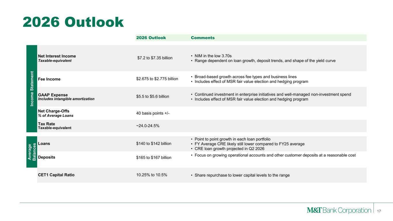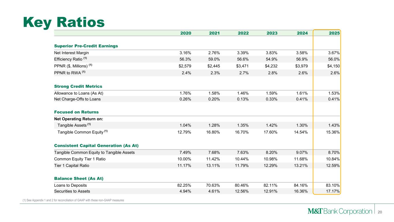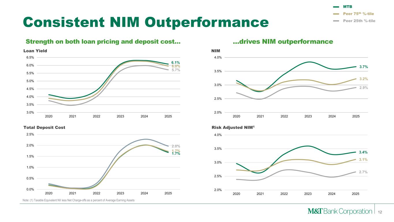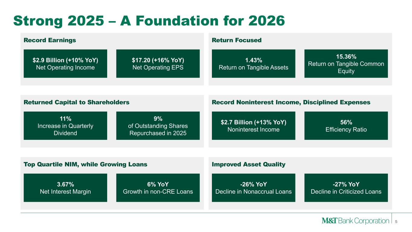 Forward-Looking Statements and Non-GAAP Financial Measures This presentation may contain forward-looking statements regarding M&T Bank Corporation (“M&T”) within the meaning of the Private Securities Litigation Reform Act of 1995 and the rules and regulations of the Securities and Exchange Commission (“SEC”). Any statement that does not describe historical or current facts is a forward-looking statement, including statements based on current expectations, estimates and projections about M&T's business, and management's beliefs and assumptions. Statements regarding the potential effects of events or factors specific to M&T and/or the financial industry as a whole, as well as national and global events generally, on M&T's business, financial condition, liquidity and results of operations may constitute forward-looking statements. Such statements are subject to the risk that the actual effects may differ, possibly materially, from what is reflected in those forward-looking statements due to factors and future developments that are uncertain, unpredictable and in many cases beyond M&T's control. Forward-looking statements are typically identified by words such as "believe," "expect," "anticipate," "intend," "target," "estimate," "continue," or "potential," by future conditional verbs such as "will," "would," "should," "could," or "may," or by variations of such words or by similar expressions. These statements are not guarantees of future performance and involve certain risks, uncertainties and assumptions which are difficult to predict and may cause actual outcomes to differ materially from what is expressed or forecasted. While there can be no assurance that any list of risks and uncertainties is complete, important factors that could cause actual outcomes and results to differ materially from those contemplated by forward-looking statements include the following, without limitation: economic conditions and growth rates, including inflation and market volatility; events, developments and current conditions in the financial services industry, including trust, brokerage and investment management businesses; changes in interest rates, spreads on earning assets and interest-bearing liabilities, and interest rate sensitivity; prepayment speeds, loan originations, loan concentrations by type and industry, credit losses and market values on loans, collateral securing loans, and other assets; sources of liquidity; levels of client deposits; ability to contain costs and expenses; changes in M&T's credit ratings; domestic or international political developments and other geopolitical events, including trade and tariff policies and international conflicts and hostilities; changes and trends in the securities markets; common shares outstanding and common stock price volatility; fair value of and number of stock-based compensation awards to be issued in future periods; the impact of changes in market values on trust-, brokerage-, and investment management-related revenues; federal, state or local legislation and/or regulations affecting the financial services industry, or M&T and its subsidiaries individually or collectively, including tax policy; regulatory supervision and oversight, including monetary policy and capital requirements; governmental and public policy changes; political conditions, either nationally or in the states in which M&T and its subsidiaries do business; the initiation and outcome of potential, pending and future litigation, investigations and governmental proceedings, including tax-related examinations and other matters; operational risk events, including loss resulting from fraud by employees or persons outside M&T and breaches in data and cybersecurity; changes in accounting policies or procedures as may be required by the Financial Accounting Standards Board, regulatory agencies or legislation; increasing price, product and service competition by competitors, including new entrants; technological developments and changes; the ability to continue to introduce competitive new products and services on a timely, cost-effective basis; the mix of products and services; protection and validity of intellectual property rights; reliance on large customers; technological, implementation and cost/financial risks in large, multi-year contracts; continued availability of financing; financial resources in the amounts, at the times and on the terms required to support M&T and its subsidiaries' future businesses; and material differences in the actual financial results of merger, acquisition, divestment and investment activities compared with M&T's initial expectations, including the full realization of anticipated cost savings and revenue enhancements. These are representative of the factors that could affect the outcome of the forward-looking statements. In addition, as noted, such statements could be affected by general industry and market conditions and growth rates, general economic and political conditions, either nationally or in the states in which M&T and its subsidiaries do business, and other factors. M&T provides further detail regarding these risks and uncertainties in its Form 10-K for the year ended December 31, 2024, including in the Risk Factors section of such report, as well as in other SEC filings. Forward-looking statements speak only as of the date they are made, and M&T assumes no duty and does not undertake to update forward-looking statements. Annualized, pro forma, projected, and estimated numbers are used for illustrative purposes only, are not forecasts and may not reflect actual results. This presentation also contains financial information and performance measures determined by methods other than in accordance with accounting principles generally accepted in the United States ("GAAP"). Management believes investors may find these non-GAAP financial measures useful. These disclosures should not be viewed as a substitute for financial measures determined i