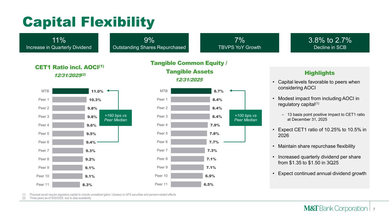 Solid Performance in Key Metrics against Peers 6 ROTA(1) FY25 Net Interest Margin FY25 Efficiency Ratio(1) FY25 PPNR / RWA(1) FY25 NCO / Loans FY25 Source: S&P Global Market Intelligence and company filings (1) See Appendix for reconciliation of GAAP with these non-GAAP measures 1.43% Peer 1 MTB Peer 2 Peer 3 Peer 4 Peer 5 Peer 6 Peer 7 Peer 8 Peer 9 Peer 10 Peer 11 3.67% MTB Peer 1 Peer 2 Peer 3 Peer 4 Peer 5 Peer 6 Peer 7 Peer 8 Peer 9 Peer 10 Peer 11 56.0% MTB Peer 1 Peer 2 Peer 3 Peer 4 Peer 5 Peer 6 Peer 7 Peer 8 Peer 9 Peer 10 Peer 11 2.6% MTB Peer 1 Peer 2 Peer 3 Peer 4 Peer 5 Peer 6 Peer 7 Peer 8 Peer 9 Peer 10 Peer 11 0.41% Peer 1 Peer 2 Peer 3 Peer 4 Peer 5 Peer 6 MTB Peer 7 Peer 8 Peer 9 Peer 10 Peer 11