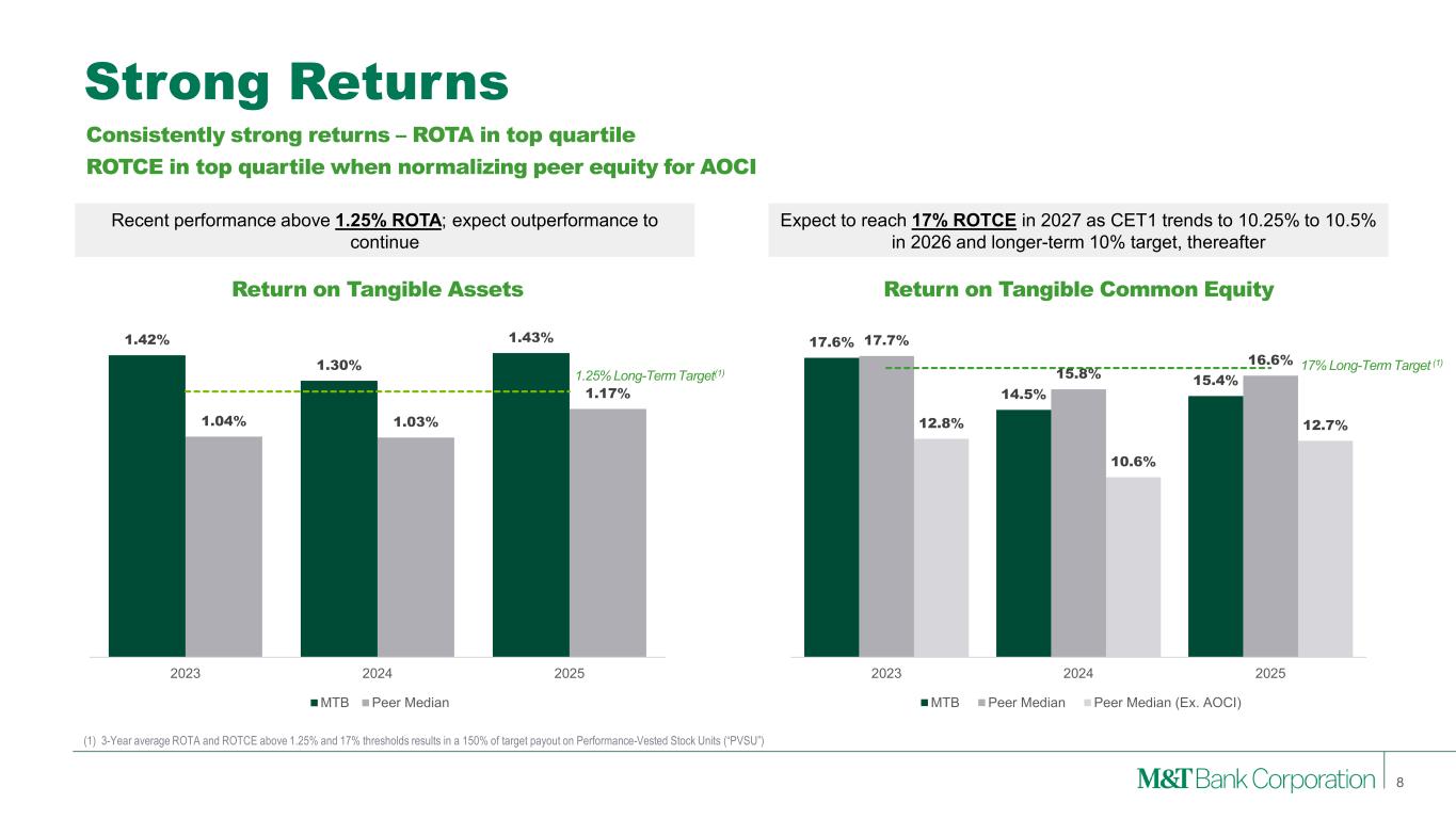 Capital Flexibility • Capital levels favorable to peers when considering AOCI • Modest impact from including AOCI in regulatory capital(1) – 13 basis point positive impact to CET1 ratio at December 31, 2025 • Expect CET1 ratio of 10.25% to 10.5% in 2026 • Maintain share repurchase flexibility • Increased quarterly dividend per share from $1.35 to $1.50 in 3Q25 • Expect continued annual dividend growth Highlights 7 11% Increase in Quarterly Dividend 9% Outstanding Shares Repurchased 7% TBVPS YoY Growth 3.8% to 2.7% Decline in SCB (1) Proposal would require regulatory capital to include unrealized gains / (losses) on AFS securities and pension-related effects (2) Three peers as-of 9/30/2025, due to data availability 8.3% 9.1% 9.1% 9.2% 9.3% 9.4% 9.5% 9.6% 9.8% 9.8% 10.3% 11.0% Peer 11 Peer 10 Peer 9 Peer 8 Peer 7 Peer 6 Peer 5 Peer 4 Peer 3 Peer 2 Peer 1 MTB 6.5% 6.9% 7.1% 7.1% 7.3% 7.7% 7.8% 7.9% 8.4% 8.4% 8.4% 8.7% Peer 11 Peer 10 Peer 9 Peer 8 Peer 7 Peer 6 Peer 5 Peer 4 Peer 3 Peer 2 Peer 1 MTB CET1 Ratio incl. AOCI(1) 12/31/2025(2) Tangible Common Equity / Tangible Assets 12/31/2025 +160 bps vs Peer Median +100 bps vs Peer Median