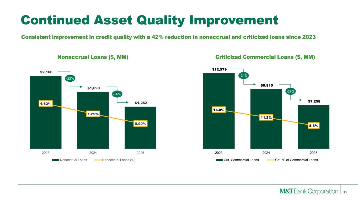 Solid Fee Growth and Disciplined Expenses 10 $409 $436 $550 $475 $514 $551 $680 $675 $724 $584 $632 $673 2023 2024 2025 Noninterest Income ($, MM) Excluding Securities G/L and Notable Items Efficiency Ratio $2,299 $2,417 $2,687 54.9% 56.9% 56.0% 62.1% 60.5% 59.3% 2023 2024 2025 MTB Peer Median +5% +11% • Solid growth in all fee categories • Mortgage aided by residential subservicing and commercial originations • Trust income growth from both Institutional Services and Wealth, including AUM growth • Fees related to our capital markets business also supported YoY growth • Increased noninterest income as a % of total revenue from 26% to 28% • Managed sequential improvement in the efficiency ratio while making significant enterprise investments that will allow M&T to thrive in the years to come • Recent enterprise investments include Finance Modernization (general ledger replacement), data centers and cloud migration, and credit delivery Trust Service Charges Mortgage Brokerage Trading / Deriv. Other Revenues