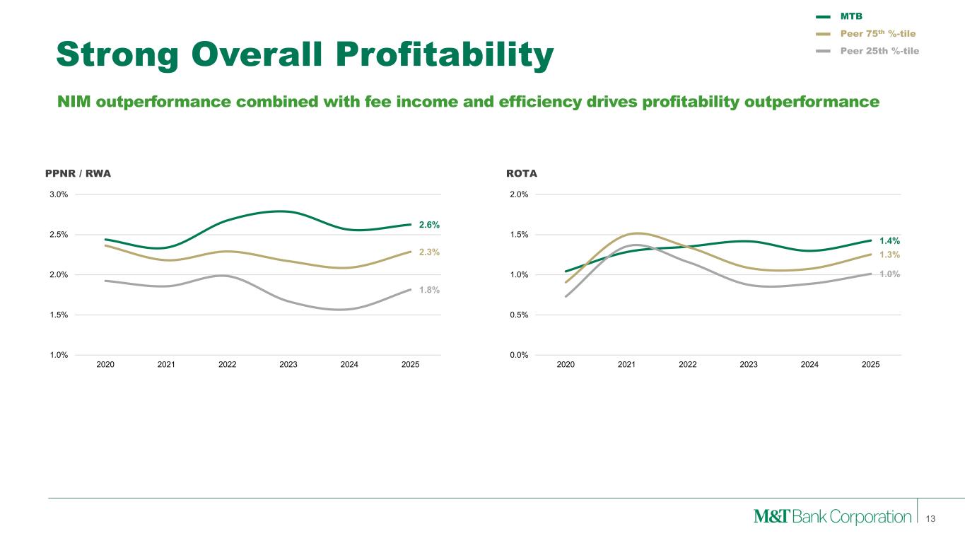 Consistent NIM Outperformance 12 Note: (1) Taxable Equivalent NII less Net Charge-offs as a percent of Average Earning Assets Strength on both loan pricing and deposit cost… …drives NIM outperformance Loan Yield NIM Total Deposit Cost Risk Adjusted NIM1 MTB Peer 75th %-tile Peer 25th %-tile 6.1% 6.0% 5.7% 3.0% 3.5% 4.0% 4.5% 5.0% 5.5% 6.0% 6.5% 2020 2021 2022 2023 2024 2025 1.7% 2.0% 1.7% 0.0% 0.5% 1.0% 1.5% 2.0% 2.5% 2020 2021 2022 2023 2024 2025 3.7% 3.2% 2.9% 2.0% 2.5% 3.0% 3.5% 4.0% 2020 2021 2022 2023 2024 2025 3.4% 2.7% 3.1% 2.0% 2.5% 3.0% 3.5% 4.0% 2020 2021 2022 2023 2024 2025