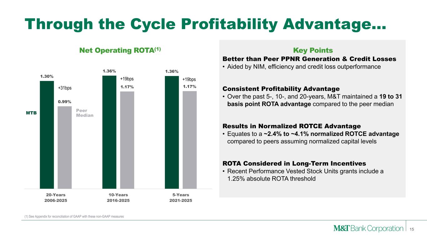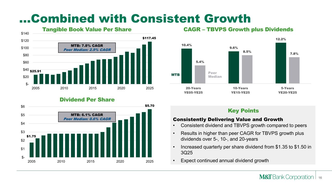 Consistent Growth 14 Profitability outperformance also combined with consistent and strong Dividend and TBVPS growth Cumulative Dividend Per Share Growth Cumulative TBVPS Growth Company Cumulative TBVPS Growth MTB 45.9% Peer 1 38.8% Peer 2 25.0% Peer 3 17.8% Peer 4 17.4% Peer 5 16.4% Peer 6 16.2% Peer 7 15.5% Peer 8 11.9% Peer 9 3.4% Peer 10 1.2% Peer 11 (2.9%) Median (excl. MTB) 16.2% Company Cumulative Div Growth Peer 1 66.1% Peer 2 43.5% Peer 3 42.6% MTB 29.5% Peer 4 29.4% Peer 5 21.4% Peer 6 15.6% Peer 7 10.8% Peer 8 10.3% Peer 9 4.4% Peer 10 3.3% Peer 11 0.0% Median (excl. MTB) 15.6% MTB Peer 75th %-tile Peer 25th %-tile 30% 36% 7% 0% 10% 20% 30% 40% 2020 2021 2022 2023 2024 2025 45.9% 7.7% 17.6% (40.0)% (30.0)% (20.0)% (10.0)% 0.0% 10.0% 20.0% 30.0% 40.0% 50.0% 2020 2021 2022 2023 2024 2025
