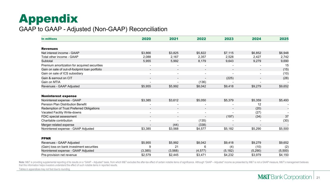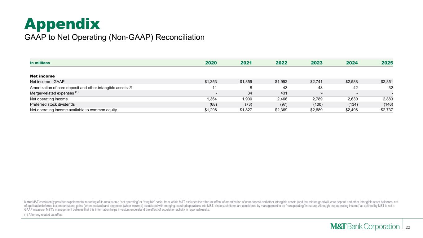Appendix Note: M&T is providing supplemental reporting of its results on a “GAAP – Adjusted” basis, from which M&T excludes the after-tax effect of certain notable items of significance. Although “GAAP – Adjusted” income as presented by M&T is not a GAAP measure, M&T’s management believes that this information helps investors understand the effect of such notable items in reported results. Tables in appendices may not foot due to rounding. GAAP to GAAP - Adjusted (Non-GAAP) Reconciliation 21 In millions 2020 2021 2022 2023 2024 2025 Revenues Net interest income - GAAP $3,866 $3,825 $5,822 $7,115 $6,852 $6,948 Total other income - GAAP 2,088 2,167 2,357 2,528 2,427 2,742 Subtotal 5,955 5,992 8,179 9,643 9,279 9,690 Premium amortization for acquired securities - - - - - 15 Gain on sale of out-of-footprint loan portfolio - - - - - (15) Gain on sale of ICS subsidiary - - - - - (10) Gain & earnout on CIT - - - (225) - (28) Gain on MTIA - - (136) - - - Revenues - GAAP Adjusted $5,955 $5,992 $8,042 $9,418 $9,279 $9,652 Noninterest expense Noninterest expense - GAAP $3,385 $3,612 $5,050 $5,379 $5,359 $5,493 Pension Plan Distribution Benefit - - - - 12 - Redemption of Trust Preferred Obligations - - - - (20) - Vacated Facility Write-downs - - - - (27) - FDIC special assessment - - - (197) (34) 37 Charitable contribution - - (135) - - (30) Merger-related expense - (44) (338) - - - Noninterest expense - GAAP Adjusted $3,385 $3,568 $4,577 $5,182 $5,290 $5,500 PPNR Revenues - GAAP Adjusted $5,955 $5,992 $8,042 $9,418 $9,279 $9,652 (Gain) loss on bank investment securities 9 21 6 (4) (10) (2) Noninterest expense - GAAP Adjusted (3,385) (3,568) (4,577) (5,182) (5,290) (5,500) Pre-provision net revenue $2,579 $2,445 $3,471 $4,232 $3,979 $4,150