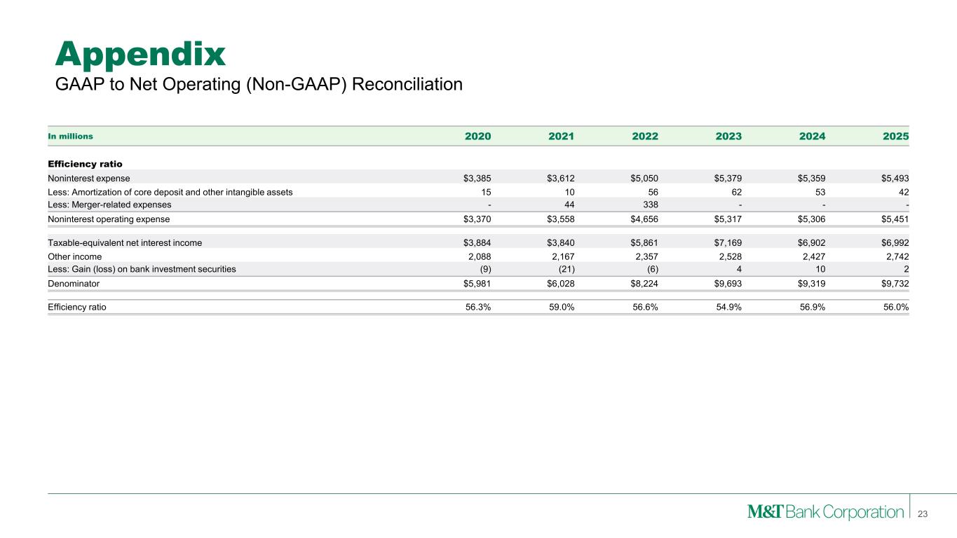 Appendix Note: M&T consistently provides supplemental reporting of its results on a “net operating” or “tangible” basis, from which M&T excludes the after-tax effect of amortization of core deposit and other intangible assets (and the related goodwill, core deposit and other intangible asset balances, net of applicable deferred tax amounts) and gains (when realized) and expenses (when incurred) associated with merging acquired operations into M&T, since such items are considered by management to be “nonoperating” in nature. Although “net operating income” as defined by M&T is not a GAAP measure, M&T’s management believes that this information helps investors understand the effect of acquisition activity in reported results. (1) After any related tax effect 22 GAAP to Net Operating (Non-GAAP) Reconciliation In millions 2020 2021 2022 2023 2024 2025 Net income Net income - GAAP $1,353 $1,859 $1,992 $2,741 $2,588 $2,851 Amortization of core deposit and other intangible assets (1) 11 8 43 48 42 32 Merger-related expenses (1) - 34 431 - - - Net operating income 1,364 1,900 2,466 2,789 2,630 2,883 Preferred stock dividends (68) (73) (97) (100) (134) (146) Net operating income available to common equity $1,296 $1,827 $2,369 $2,689 $2,496 $2,737