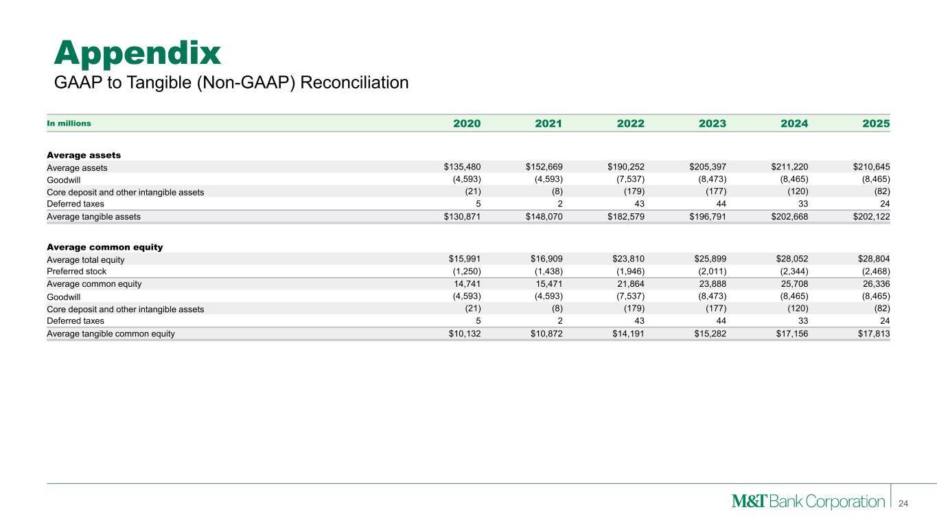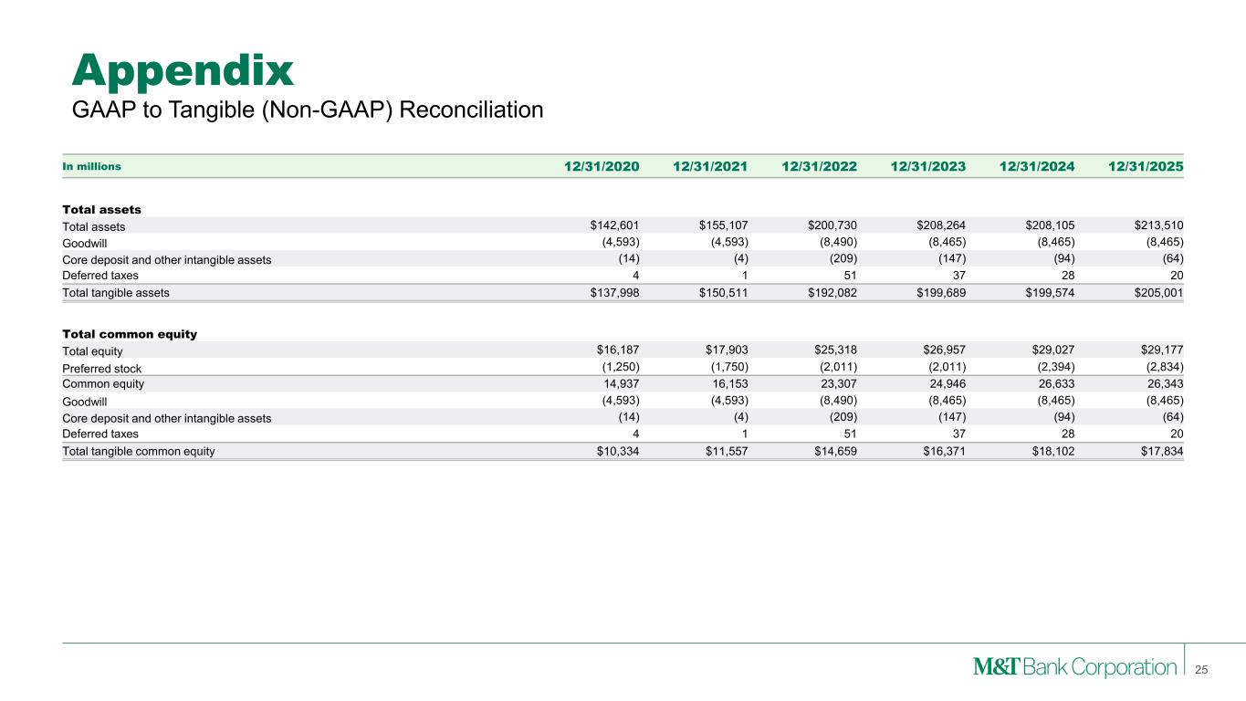 Appendix GAAP to Tangible (Non-GAAP) Reconciliation 24 In millions 2020 2021 2022 2023 2024 2025 Average assets Average assets $135,480 $152,669 $190,252 $205,397 $211,220 $210,645 Goodwill (4,593) (4,593) (7,537) (8,473) (8,465) (8,465) Core deposit and other intangible assets (21) (8) (179) (177) (120) (82) Deferred taxes 5 2 43 44 33 24 Average tangible assets $130,871 $148,070 $182,579 $196,791 $202,668 $202,122 Average common equity Average total equity $15,991 $16,909 $23,810 $25,899 $28,052 $28,804 Preferred stock (1,250) (1,438) (1,946) (2,011) (2,344) (2,468) Average common equity 14,741 15,471 21,864 23,888 25,708 26,336 Goodwill (4,593) (4,593) (7,537) (8,473) (8,465) (8,465) Core deposit and other intangible assets (21) (8) (179) (177) (120) (82) Deferred taxes 5 2 43 44 33 24 Average tangible common equity $10,132 $10,872 $14,191 $15,282 $17,156 $17,813