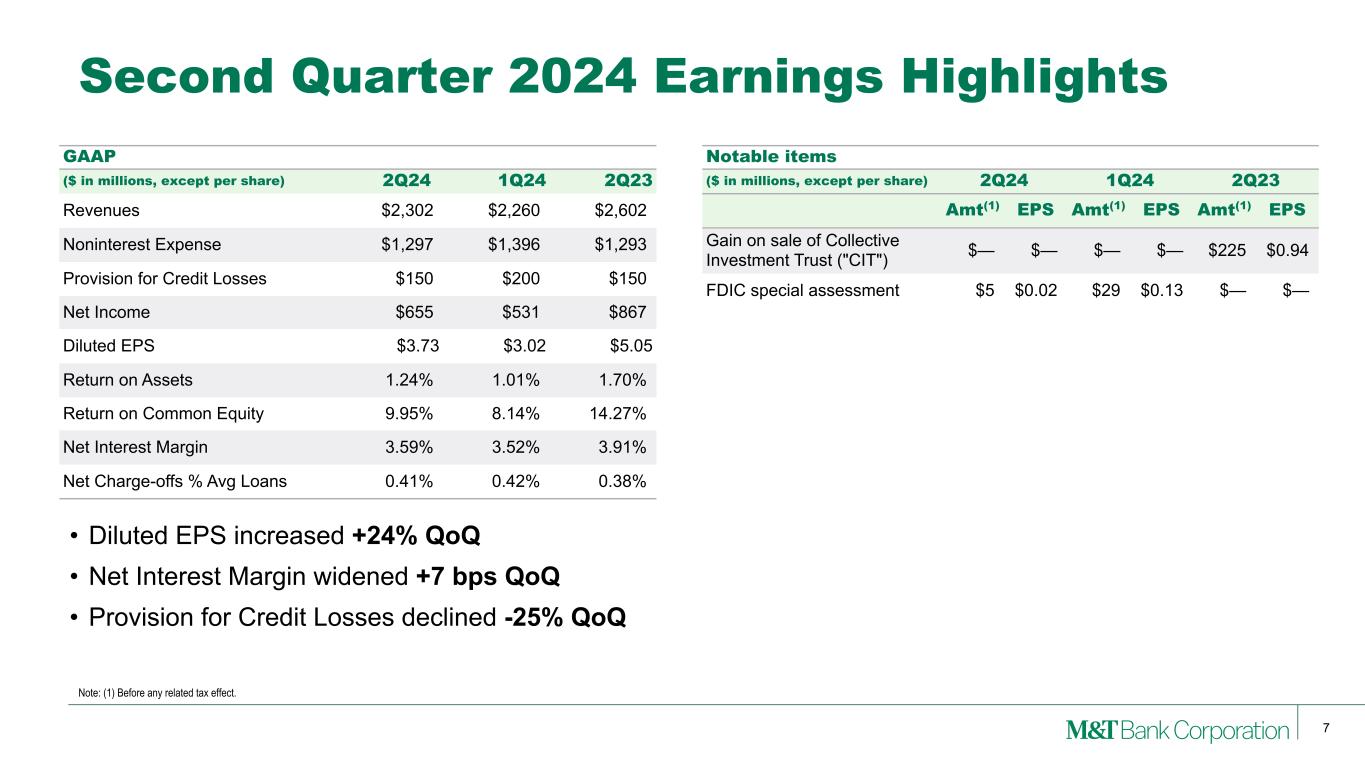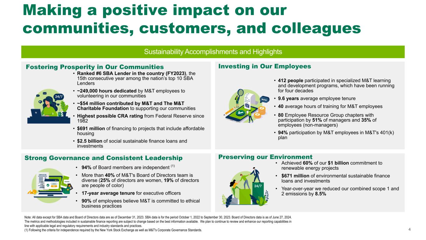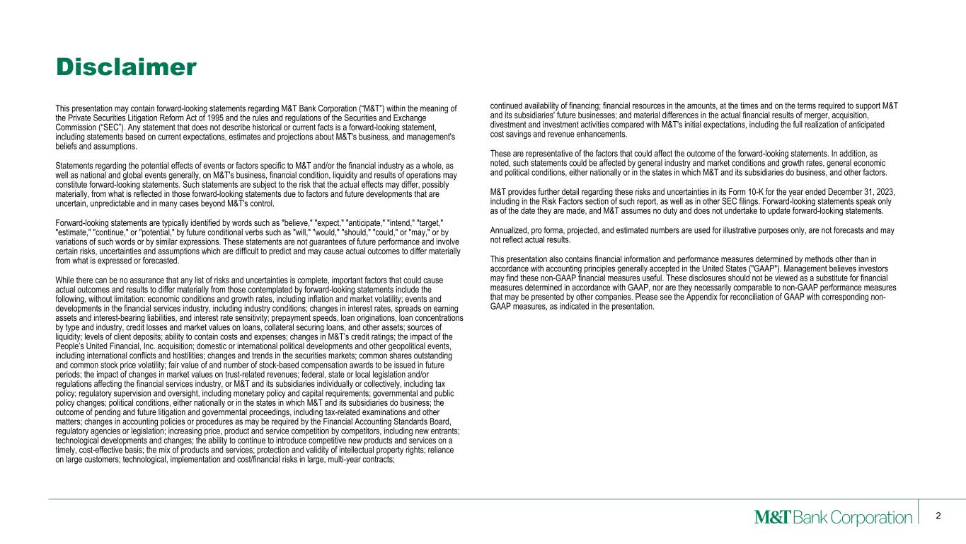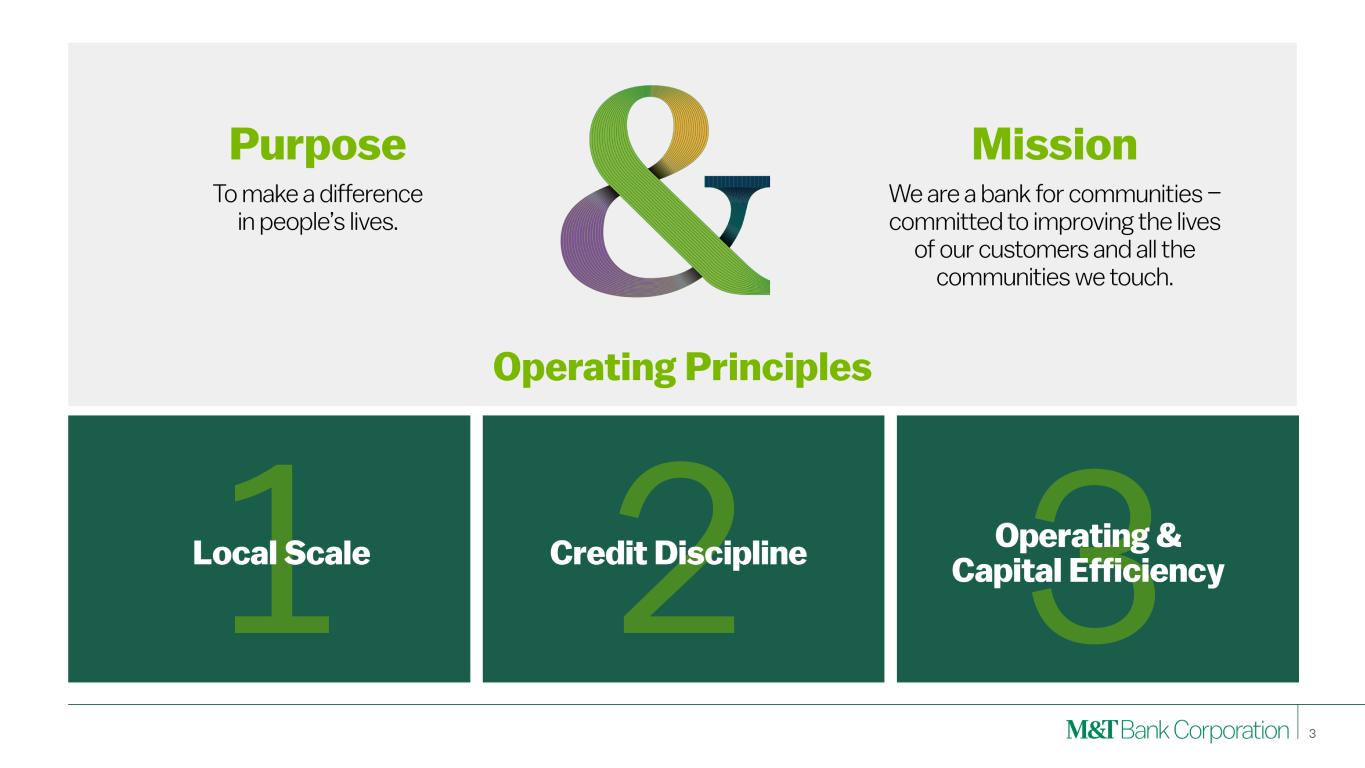 2 This presentation may contain forward-looking statements regarding M&T Bank Corporation (“M&T”) within the meaning of the Private Securities Litigation Reform Act of 1995 and the rules and regulations of the Securities and Exchange Commission (“SEC”). Any statement that does not describe historical or current facts is a forward-looking statement, including statements based on current expectations, estimates and projections about M&T's business, and management's beliefs and assumptions. Statements regarding the potential effects of events or factors specific to M&T and/or the financial industry as a whole, as well as national and global events generally, on M&T's business, financial condition, liquidity and results of operations may constitute forward-looking statements. Such statements are subject to the risk that the actual effects may differ, possibly materially, from what is reflected in those forward-looking statements due to factors and future developments that are uncertain, unpredictable and in many cases beyond M&T's control. Forward-looking statements are typically identified by words such as "believe," "expect," "anticipate," "intend," "target," "estimate," "continue," or "potential," by future conditional verbs such as "will," "would," "should," "could," or "may," or by variations of such words or by similar expressions. These statements are not guarantees of future performance and involve certain risks, uncertainties and assumptions which are difficult to predict and may cause actual outcomes to differ materially from what is expressed or forecasted. While there can be no assurance that any list of risks and uncertainties is complete, important factors that could cause actual outcomes and results to differ materially from those contemplated by forward-looking statements include the following, without limitation: economic conditions and growth rates, including inflation and market volatility; events and developments in the financial services industry, including industry conditions; changes in interest rates, spreads on earning assets and interest-bearing liabilities, and interest rate sensitivity; prepayment speeds, loan originations, loan concentrations by type and industry, credit losses and market values on loans, collateral securing loans, and other assets; sources of liquidity; levels of client deposits; ability to contain costs and expenses; changes in M&T’s credit ratings; the impact of the People’s United Financial, Inc. acquisition; domestic or international political developments and other geopolitical events, including international conflicts and hostilities; changes and trends in the securities markets; common shares outstanding and common stock price volatility; fair value of and number of stock-based compensation awards to be issued in future periods; the impact of changes in market values on trust-related revenues; federal, state or local legislation and/or regulations affecting the financial services industry, or M&T and its subsidiaries individually or collectively, including tax policy; regulatory supervision and oversight, including monetary policy and capital requirements; governmental and public policy changes; political conditions, either nationally or in the states in which M&T and its subsidiaries do business; the outcome of pending and future litigation and governmental proceedings, including tax-related examinations and other matters; changes in accounting policies or procedures as may be required by the Financial Accounting Standards Board, regulatory agencies or legislation; increasing price, product and service competition by competitors, including new entrants; technological developments and changes; the ability to continue to introduce competitive new products and services on a timely, cost-effective basis; the mix of products and services; protection and validity of intellectual property rights; reliance on large customers; technological, implementation and cost/financial risks in large, multi-year contracts; continued availability of financing; financial resources in the amounts, at the times and on the terms required to support M&T and its subsidiaries' future businesses; and material differences in the actual financial results of merger, acquisition, divestment and investment activities compared with M&T's initial expectations, including the full realization of anticipated cost savings and revenue enhancements. These are representative of the factors that could affect the outcome of the forward-looking statements. In addition, as noted, such statements could be affected by general industry and market conditions and growth rates, general economic and political conditions, either nationally or in the states in which M&T and its subsidiaries do business, and other factors. M&T provides further detail regarding these risks and uncertainties in its Form 10-K for the year ended December 31, 2023, including in the Risk Factors section of such report, as well as in other SEC filings. Forward-looking statements speak only as of the date they are made, and M&T assumes no duty and does not undertake to update forward-looking statements. Annualized, pro forma, projected, and estimated numbers are used for illustrative purposes only, are not forecasts and may not reflect actual results. This presentation also contains financial information and performance measures determined by methods other than in accordance with accounting principles generally accepted in the United States ("GAAP"). Management believes investors may find these non-GAAP financial measures useful. These disclosures should not be viewed as a substitute for financial measures determined in accordance with GAAP, nor are they necessarily comparable to non-GAAP performance measures that may be presented by other companies. Please see the Appendix for reconciliation of GAAP with corresponding non- GAAP measures, as indicated in the presentation. Disclaimer