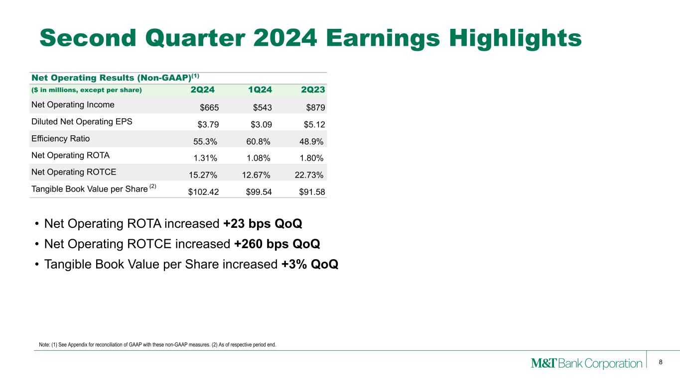 7 • Diluted EPS increased +24% QoQ • Net Interest Margin widened +7 bps QoQ • Provision for Credit Losses declined -25% QoQ Notable items ($ in millions, except per share) 2Q24 1Q24 2Q23 Amt(1) EPS Amt(1) EPS Amt(1) EPS Gain on sale of Collective Investment Trust ("CIT") $— $— $— $— $225 $0.94 FDIC special assessment $5 $0.02 $29 $0.13 $— $— Second Quarter 2024 Earnings Highlights GAAP ($ in millions, except per share) 2Q24 1Q24 2Q23 Revenues $2,302 $2,260 $2,602 Noninterest Expense $1,297 $1,396 $1,293 Provision for Credit Losses $150 $200 $150 Net Income $655 $531 $867 Diluted EPS $3.73 $3.02 $5.05 Return on Assets 1.24% 1.01% 1.70% Return on Common Equity 9.95% 8.14% 14.27% Net Interest Margin 3.59% 3.52% 3.91% Net Charge-offs % Avg Loans 0.41% 0.42% 0.38% Note: (1) Before any related tax effect.