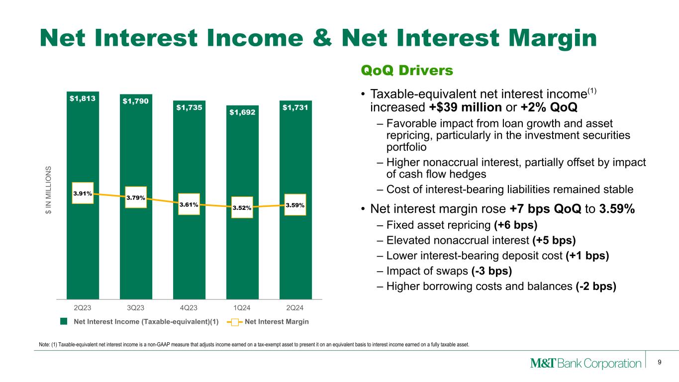 8 Note: (1) See Appendix for reconciliation of GAAP with these non-GAAP measures. (2) As of respective period end. Second Quarter 2024 Earnings Highlights Net Operating Results (Non-GAAP)(1) ($ in millions, except per share) 2Q24 1Q24 2Q23 Net Operating Income $665 $543 $879 Diluted Net Operating EPS $3.79 $3.09 $5.12 Efficiency Ratio 55.3% 60.8% 48.9% Net Operating ROTA 1.31% 1.08% 1.80% Net Operating ROTCE 15.27% 12.67% 22.73% Tangible Book Value per Share (2) $102.42 $99.54 $91.58 • Net Operating ROTA increased +23 bps QoQ • Net Operating ROTCE increased +260 bps QoQ • Tangible Book Value per Share increased +3% QoQ
