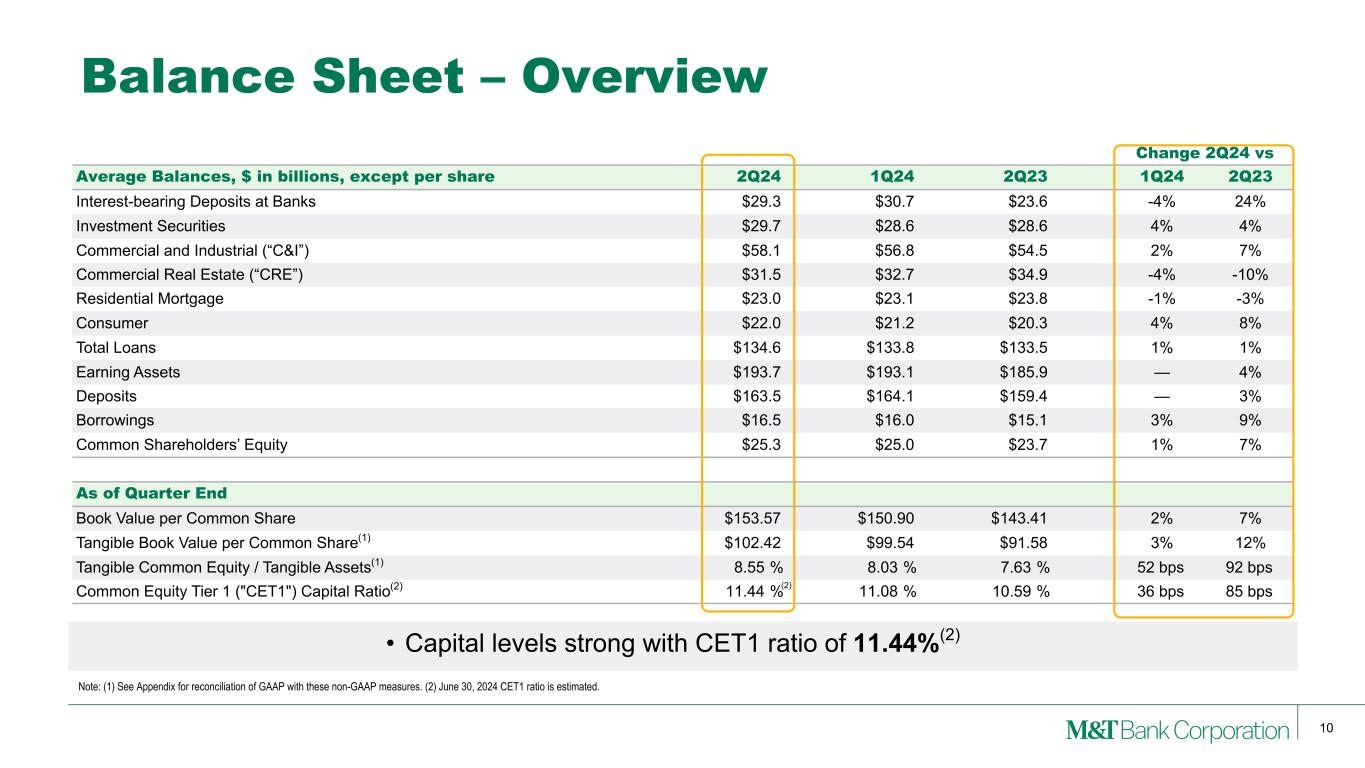 9 Net Interest Income & Net Interest Margin QoQ Drivers • Taxable-equivalent net interest income(1) increased +$39 million or +2% QoQ – Favorable impact from loan growth and asset repricing, particularly in the investment securities portfolio – Higher nonaccrual interest, partially offset by impact of cash flow hedges – Cost of interest-bearing liabilities remained stable • Net interest margin rose +7 bps QoQ to 3.59% – Fixed asset repricing (+6 bps) – Elevated nonaccrual interest (+5 bps) – Lower interest-bearing deposit cost (+1 bps) – Impact of swaps (-3 bps) – Higher borrowing costs and balances (-2 bps) Note: (1) Taxable-equivalent net interest income is a non-GAAP measure that adjusts income earned on a tax-exempt asset to present it on an equivalent basis to interest income earned on a fully taxable asset. $ IN M IL LI O N S $1,813 $1,790 $1,735 $1,692 $1,731 3.91% 3.79% 3.61% 3.52% 3.59% Net Interest Income (Taxable-equivalent)(1) Net Interest Margin 2Q23 3Q23 4Q23 1Q24 2Q24