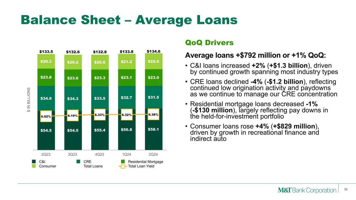 10 Change 2Q24 vs Average Balances, $ in billions, except per share 2Q24 1Q24 2Q23 1Q24 2Q23 Interest-bearing Deposits at Banks $29.3 $30.7 $23.6 -4% 24% Investment Securities $29.7 $28.6 $28.6 4% 4% Commercial and Industrial (“C&I”) $58.1 $56.8 $54.5 2% 7% Commercial Real Estate (“CRE”) $31.5 $32.7 $34.9 -4% -10% Residential Mortgage $23.0 $23.1 $23.8 -1% -3% Consumer $22.0 $21.2 $20.3 4% 8% Total Loans $134.6 $133.8 $133.5 1% 1% Earning Assets $193.7 $193.1 $185.9 — 4% Deposits $163.5 $164.1 $159.4 — 3% Borrowings $16.5 $16.0 $15.1 3% 9% Common Shareholders’ Equity $25.3 $25.0 $23.7 1% 7% As of Quarter End Book Value per Common Share $153.57 $150.90 $143.41 2% 7% Tangible Book Value per Common Share(1) $102.42 $99.54 $91.58 3% 12% Tangible Common Equity / Tangible Assets(1) 8.55 % 8.03 % 7.63 % 52 bps 92 bps Common Equity Tier 1 ("CET1") Capital Ratio(2) 11.44 % 11.08 % 10.59 % 36 bps 85 bps Balance Sheet – Overview Note: (1) See Appendix for reconciliation of GAAP with these non-GAAP measures. (2) June 30, 2024 CET1 ratio is estimated. (2) • Capital levels strong with CET1 ratio of 11.44%(2)