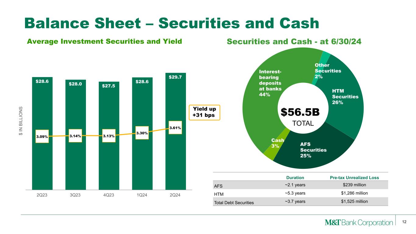 11 Balance Sheet – Average Loans QoQ Drivers Average loans +$792 million or +1% QoQ: • C&I loans increased +2% (+$1.3 billion), driven by continued growth spanning most industry types • CRE loans declined -4% (-$1.2 billion), reflecting continued low origination activity and paydowns as we continue to manage our CRE concentration • Residential mortgage loans decreased -1% (-$130 million), largely reflecting pay downs in the held-for-investment portfolio • Consumer loans rose +4% (+$829 million), driven by growth in recreational finance and indirect auto $ IN B IL LI O N S $54.5 $54.5 $55.4 $56.8 $58.1 $34.9 $34.3 $33.5 $32.7 $31.5 $23.8 $23.6 $23.3 $23.1 $23.0 $20.3 $20.2 $20.6 $21.2 $22.0 $133.5 $132.6 $132.8 $133.8 $134.6 6.02% 6.19% 6.33% 6.32% 6.38% C&I CRE Residential Mortgage Consumer Total Loans Total Loan Yield 2Q23 3Q23 4Q23 1Q24 2Q24