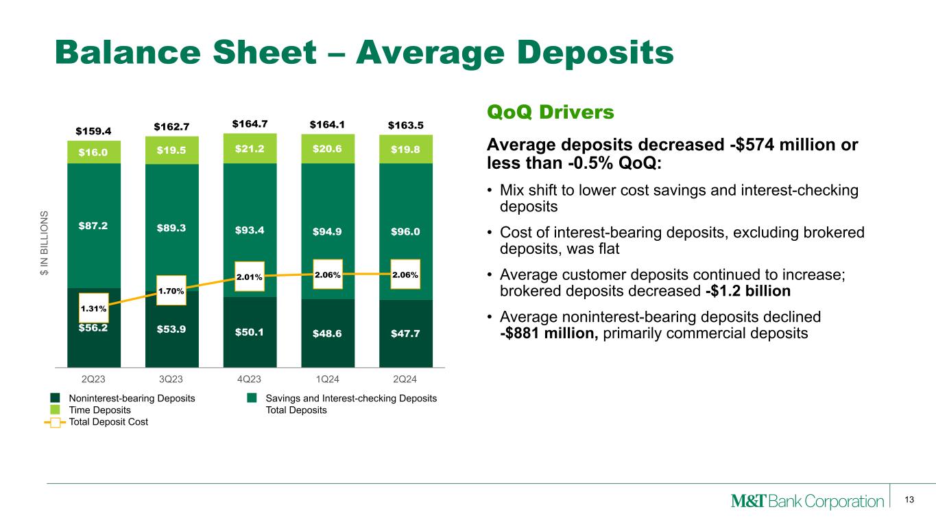 12 Balance Sheet – Securities and Cash Duration Pre-tax Unrealized Loss AFS ~2.1 years $239 million HTM ~5.3 years $1,286 million Total Debt Securities ~3.7 years $1,525 million $ IN B IL LI O N S Average Investment Securities and Yield $28.6 $28.0 $27.5 $28.6 $29.7 3.09% 3.14% 3.13% 3.30% 3.61% 2Q23 3Q23 4Q23 1Q24 2Q24 Cash 3% Interest- bearing deposits at banks 44% Other Securities 2% HTM Securities 26% AFS Securities 25% $56.5B TOTAL Yield up +31 bps Securities and Cash - at 6/30/24