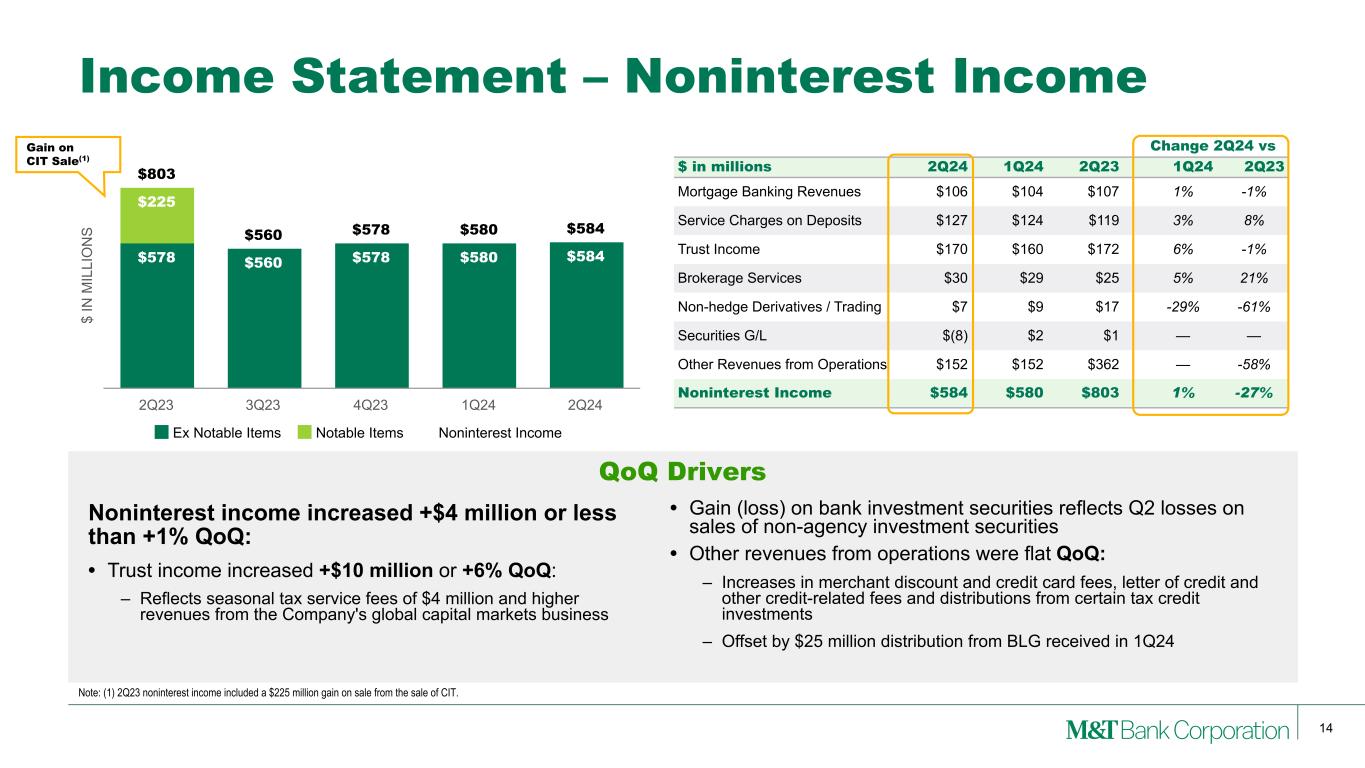 13 Balance Sheet – Average Deposits QoQ Drivers Average deposits decreased -$574 million or less than -0.5% QoQ: • Mix shift to lower cost savings and interest-checking deposits • Cost of interest-bearing deposits, excluding brokered deposits, was flat • Average customer deposits continued to increase; brokered deposits decreased -$1.2 billion • Average noninterest-bearing deposits declined -$881 million, primarily commercial deposits $ IN B IL LI O N S $56.2 $53.9 $50.1 $48.6 $47.7 $87.2 $89.3 $93.4 $94.9 $96.0 $16.0 $19.5 $21.2 $20.6 $19.8 $159.4 $162.7 $164.7 $164.1 $163.5 1.31% 1.70% 2.01% 2.06% 2.06% Noninterest-bearing Deposits Savings and Interest-checking Deposits Time Deposits Total Deposits Total Deposit Cost 2Q23 3Q23 4Q23 1Q24 2Q24