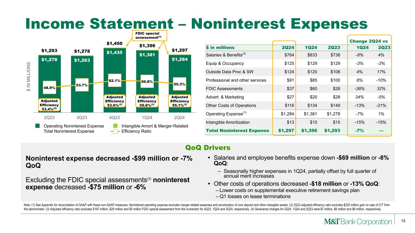 14 $ IN M IL LI O N S $578 $560 $578 $580 $584 $225 $803 $560 $578 $580 $584 Ex Notable Items Notable Items Noninterest Income 2Q23 3Q23 4Q23 1Q24 2Q24 Change 2Q24 vs $ in millions 2Q24 1Q24 2Q23   1Q24 2Q23 Mortgage Banking Revenues $106 $104 $107 1% -1% Service Charges on Deposits $127 $124 $119 3% 8% Trust Income $170 $160 $172 6% -1% Brokerage Services $30 $29 $25 5% 21% Non-hedge Derivatives / Trading $7 $9 $17 -29% -61% Securities G/L $(8) $2 $1 — — Other Revenues from Operations $152 $152 $362 — -58% Noninterest Income $584 $580 $803   1% -27% Income Statement – Noninterest Income Noninterest income increased +$4 million or less than +1% QoQ: • Trust income increased +$10 million or +6% QoQ: – Reflects seasonal tax service fees of $4 million and higher revenues from the Company's global capital markets business • Gain (loss) on bank investment securities reflects Q2 losses on sales of non-agency investment securities • Other revenues from operations were flat QoQ: – Increases in merchant discount and credit card fees, letter of credit and other credit-related fees and distributions from certain tax credit investments – Offset by $25 million distribution from BLG received in 1Q24 Note: (1) 2Q23 noninterest income included a $225 million gain on sale from the sale of CIT. QoQ Drivers Gain on CIT Sale(1)