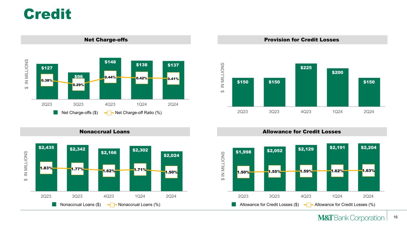 15 Change 2Q24 vs $ in millions 2Q24 1Q24 2Q23 1Q24 2Q23 Salaries & Benefits(4) $764 $833 $738 -8% 4% Equip & Occupancy $125 $129 $129 -3% -3% Outside Data Proc & SW $124 $120 $106 4% 17% Professional and other services $91 $85 $100 6% -10% FDIC Assessments $37 $60 $28 -38% 32% Advert. & Marketing $27 $20 $28 34% -5% Other Costs of Operations $116 $134 $149 -13% -21% Operating Expense(1) $1,284 $1,381 $1,278 -7% 1% Intangible Amortization $13 $15 $15 -15% -15% Total Noninterest Expense $1,297 $1,396 $1,293   -7% — Income Statement – Noninterest Expenses Noninterest expense decreased -$99 million or -7% QoQ Excluding the FDIC special assessments(3) noninterest expense decreased -$75 million or -6% • Salaries and employee benefits expense down -$69 million or -8% QoQ: – Seasonally higher expenses in 1Q24, partially offset by full quarter of annual merit increases • Other costs of operations decreased -$18 million or -13% QoQ: – Lower costs on supplemental executive retirement savings plan – Q1 losses on lease terminations Note: (1) See Appendix for reconciliation of GAAP with these non-GAAP measures. Noninterest operating expense excludes merger-related expenses and amortization of core deposit and other intangible assets. (2) 2Q23 adjusted efficiency ratio excludes $225 million gain on sale of CIT from the denominator. (3) Adjusted efficiency ratio excludes $197 million, $29 million and $5 million FDIC special assessment from the numerator for 4Q23, 1Q24 and 2Q24, respectively. (4) Severance charges for 2Q24, 1Q24 and 2Q23 were $7 million, $6 million and $8 million, respectively. QoQ Drivers $ IN M IL LI O N S $1,278 $1,263 $1,435 $1,381 $1,284 $1,293 $1,278 $1,450 $1,396 $1,297 48.9% 53.7% 62.1% 60.8% 55.3% Operating Noninterest Expense Intangible Amort & Merger-Related Total Noninterest Expense Efficiency Ratio 2Q23 3Q23 4Q23 1Q24 2Q24 Adjusted Efficiency 59.6%(3) Adjusted Efficiency 53.4%(2) Adjusted Efficiency 53.6%(3) Adjusted Efficiency 55.1%(3) FDIC special assessment(3)