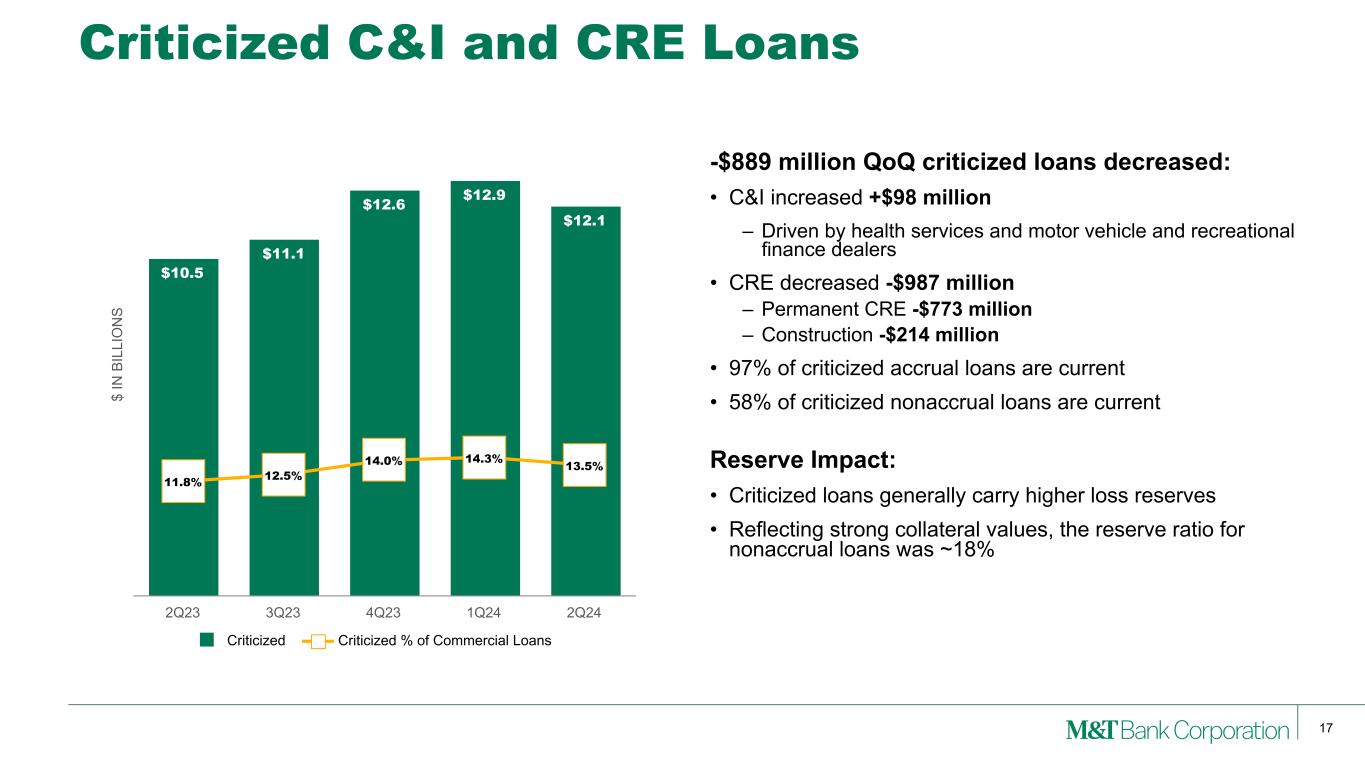 16 $ IN M IL LI O N S Nonaccrual Loans $2,435 $2,342 $2,166 $2,302 $2,024 1.83% 1.77% 1.62% 1.71% 1.50% Nonaccrual Loans ($) Nonaccrual Loans (%) 2Q23 3Q23 4Q23 1Q24 2Q24 $ IN M IL LI O N S Net Charge-offs $127 $96 $148 $138 $137 0.38% 0.29% 0.44% 0.42% 0.41% Net Charge-offs ($) Net Charge-off Ratio (%) 2Q23 3Q23 4Q23 1Q24 2Q24 Credit $ IN M IL LI O N S Allowance for Credit Losses $1,998 $2,052 $2,129 $2,191 $2,204 1.50% 1.55% 1.59% 1.62% 1.63% Allowance for Credit Losses ($) Allowance for Credit Losses (%) 2Q23 3Q23 4Q23 1Q24 2Q24 $ IN M IL LI O N S Provision for Credit Losses $150 $150 $225 $200 $150 2Q23 3Q23 4Q23 1Q24 2Q24