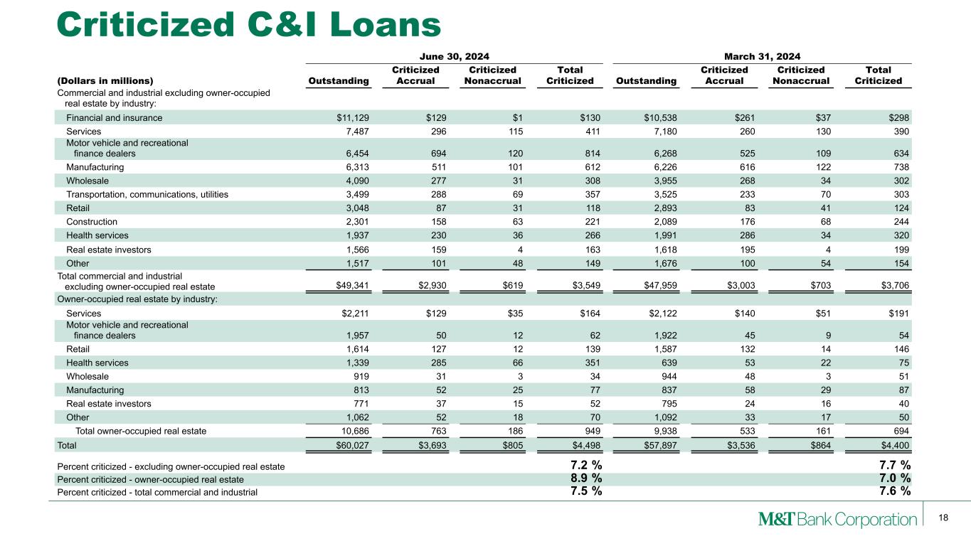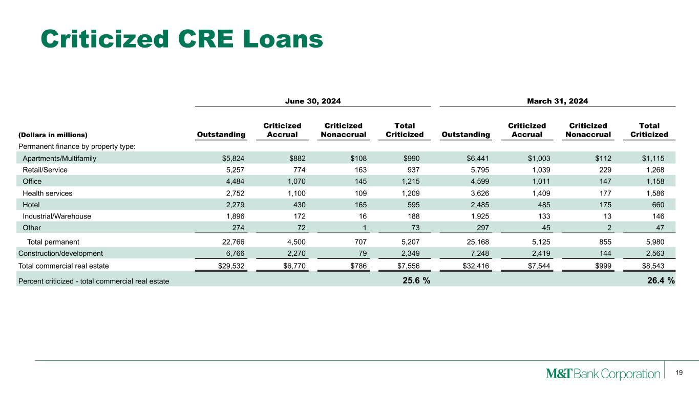 18 Criticized C&I Loans June 30, 2024 March 31, 2024 (Dollars in millions) Outstanding Criticized Accrual Criticized Nonaccrual Total Criticized Outstanding Criticized Accrual Criticized Nonaccrual Total Criticized Commercial and industrial excluding owner-occupied real estate by industry: Financial and insurance $11,129 $129 $1 $130 $10,538 $261 $37 $298 Services 7,487 296 115 411 7,180 260 130 390 Motor vehicle and recreational finance dealers 6,454 694 120 814 6,268 525 109 634 Manufacturing 6,313 511 101 612 6,226 616 122 738 Wholesale 4,090 277 31 308 3,955 268 34 302 Transportation, communications, utilities 3,499 288 69 357 3,525 233 70 303 Retail 3,048 87 31 118 2,893 83 41 124 Construction 2,301 158 63 221 2,089 176 68 244 Health services 1,937 230 36 266 1,991 286 34 320 Real estate investors 1,566 159 4 163 1,618 195 4 199 Other 1,517 101 48 149 1,676 100 54 154 Total commercial and industrial excluding owner-occupied real estate $49,341 $2,930 $619 $3,549 $47,959 $3,003 $703 $3,706 Owner-occupied real estate by industry: Services $2,211 $129 $35 $164 $2,122 $140 $51 $191 Motor vehicle and recreational finance dealers 1,957 50 12 62 1,922 45 9 54 Retail 1,614 127 12 139 1,587 132 14 146 Health services 1,339 285 66 351 639 53 22 75 Wholesale 919 31 3 34 944 48 3 51 Manufacturing 813 52 25 77 837 58 29 87 Real estate investors 771 37 15 52 795 24 16 40 Other 1,062 52 18 70 1,092 33 17 50 Total owner-occupied real estate 10,686 763 186 949 9,938 533 161 694 Total $60,027 $3,693 $805 $4,498 $57,897 $3,536 $864 $4,400 Percent criticized - excluding owner-occupied real estate 7.2 % 7.7 % Percent criticized - owner-occupied real estate 8.9 % 7.0 % Percent criticized - total commercial and industrial 7.5 % 7.6 %