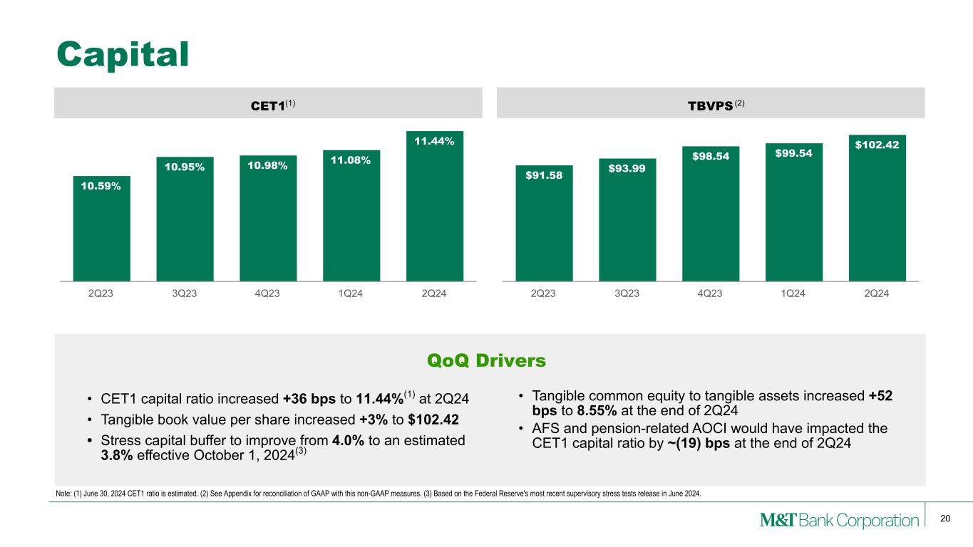 19 Criticized CRE Loans June 30, 2024 March 31, 2024 (Dollars in millions) Outstanding Criticized Accrual Criticized Nonaccrual Total Criticized Outstanding Criticized Accrual Criticized Nonaccrual Total Criticized Permanent finance by property type: Apartments/Multifamily $5,824 $882 $108 $990 $6,441 $1,003 $112 $1,115 Retail/Service 5,257 774 163 937 5,795 1,039 229 1,268 Office 4,484 1,070 145 1,215 4,599 1,011 147 1,158 Health services 2,752 1,100 109 1,209 3,626 1,409 177 1,586 Hotel 2,279 430 165 595 2,485 485 175 660 Industrial/Warehouse 1,896 172 16 188 1,925 133 13 146 Other 274 72 1 73 297 45 2 47 Total permanent 22,766 4,500 707 5,207 25,168 5,125 855 5,980 Construction/development 6,766 2,270 79 2,349 7,248 2,419 144 2,563 Total commercial real estate $29,532 $6,770 $786 $7,556 $32,416 $7,544 $999 $8,543 Percent criticized - total commercial real estate 25.6 % 26.4 %