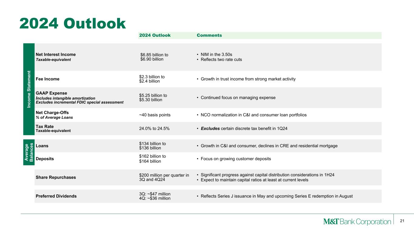 20 CET1 10.59% 10.95% 10.98% 11.08% 11.44% 2Q23 3Q23 4Q23 1Q24 2Q24 TBVPS $91.58 $93.99 $98.54 $99.54 $102.42 2Q23 3Q23 4Q23 1Q24 2Q24 Capital • CET1 capital ratio increased +36 bps to 11.44%(1) at 2Q24 • Tangible book value per share increased +3% to $102.42 • Stress capital buffer to improve from 4.0% to an estimated 3.8% effective October 1, 2024(3) Note: (1) June 30, 2024 CET1 ratio is estimated. (2) See Appendix for reconciliation of GAAP with this non-GAAP measures. (3) Based on the Federal Reserve's most recent supervisory stress tests release in June 2024. QoQ Drivers • Tangible common equity to tangible assets increased +52 bps to 8.55% at the end of 2Q24 • AFS and pension-related AOCI would have impacted the CET1 capital ratio by ~(19) bps at the end of 2Q24 (1) (2)