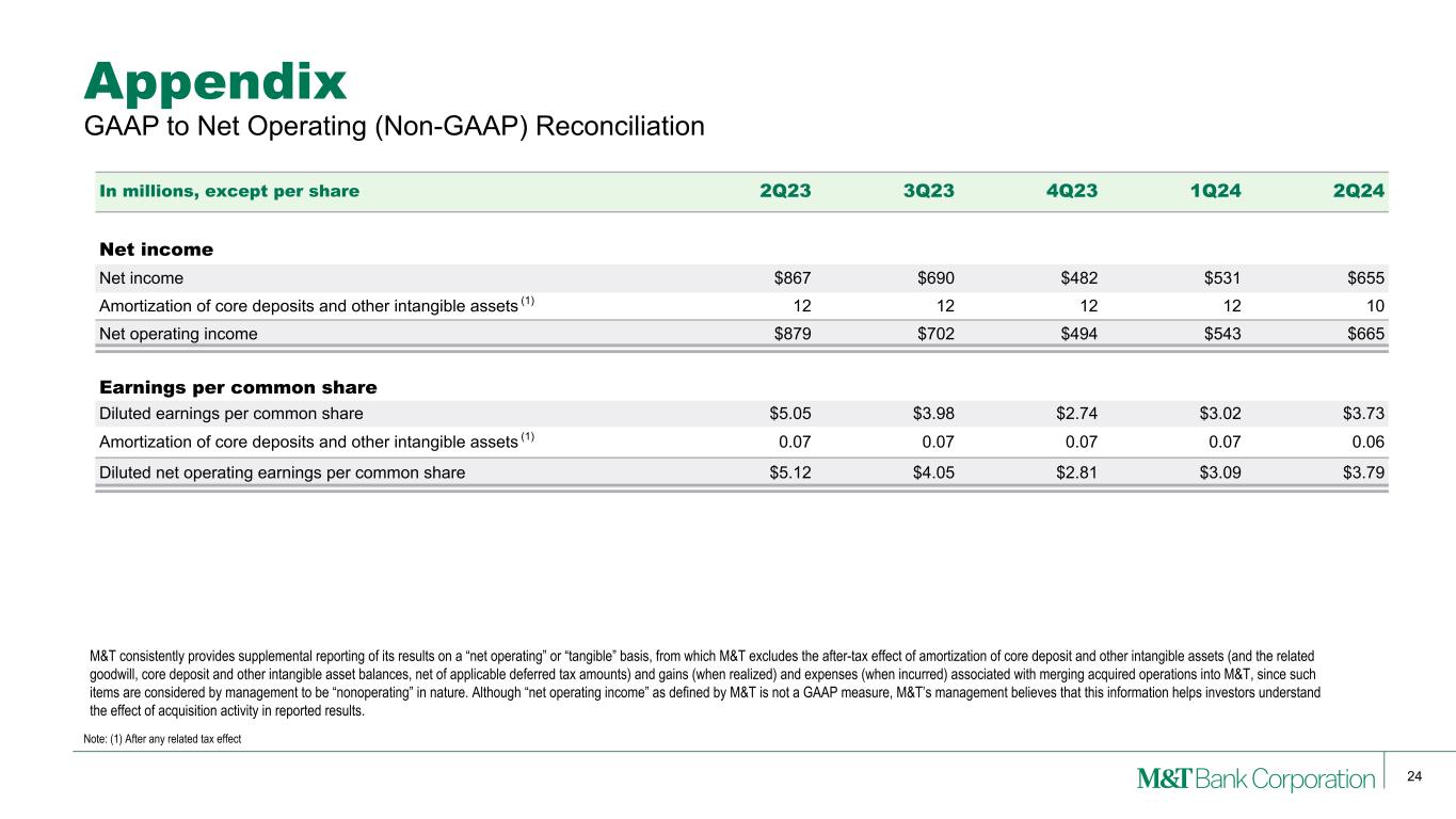 24 M&T consistently provides supplemental reporting of its results on a “net operating” or “tangible” basis, from which M&T excludes the after-tax effect of amortization of core deposit and other intangible assets (and the related goodwill, core deposit and other intangible asset balances, net of applicable deferred tax amounts) and gains (when realized) and expenses (when incurred) associated with merging acquired operations into M&T, since such items are considered by management to be “nonoperating” in nature. Although “net operating income” as defined by M&T is not a GAAP measure, M&T’s management believes that this information helps investors understand the effect of acquisition activity in reported results. Appendix Note: (1) After any related tax effect GAAP to Net Operating (Non-GAAP) Reconciliation In millions, except per share 2Q23 3Q23 4Q23 1Q24 2Q24 Net income Net income $867 $690 $482 $531 $655 Amortization of core deposits and other intangible assets (1) 12 12 12 12 10 Net operating income $879 $702 $494 $543 $665 Earnings per common share Diluted earnings per common share $5.05 $3.98 $2.74 $3.02 $3.73 Amortization of core deposits and other intangible assets (1) 0.07 0.07 0.07 0.07 0.06 Diluted net operating earnings per common share $5.12 $4.05 $2.81 $3.09 $3.79