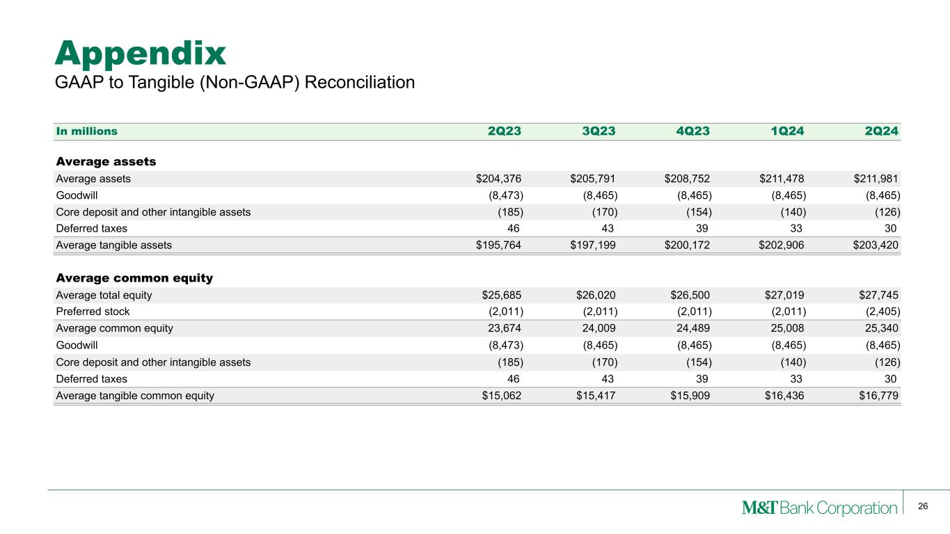 25 Appendix GAAP to Net Operating (Non-GAAP) Reconciliation In millions 2Q23 3Q23 4Q23 1Q24 2Q24 Other expense Other expense $1,293 $1,278 $1,450 $1,396 $1,297 Amortization of core deposit and other intangible assets (15) (15) (15) (15) (13) Noninterest operating expense $1,278 $1,263 $1,435 $1,381 $1,284 Efficiency ratio Noninterest operating expense (numerator) $1,278 $1,263 $1,435 $1,381 $1,284 Taxable-equivalent net interest income 1,813 1,790 1,735 1,692 1,731 Other income 803 560 578 580 584 Less: Gain (loss) on bank investment securities 1 — 4 2 (8) Denominator $2,615 $2,350 $2,309 $2,270 $2,323 Efficiency ratio 48.9 % 53.7 % 62.1 % 60.8 % 55.3 %
