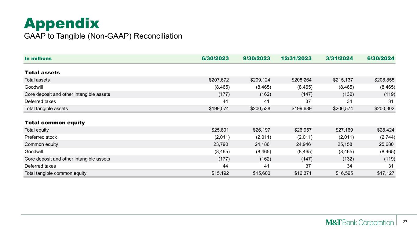 26 Appendix In millions 2Q23 3Q23 4Q23 1Q24 2Q24 Average assets Average assets $204,376 $205,791 $208,752 $211,478 $211,981 Goodwill (8,473) (8,465) (8,465) (8,465) (8,465) Core deposit and other intangible assets (185) (170) (154) (140) (126) Deferred taxes 46 43 39 33 30 Average tangible assets $195,764 $197,199 $200,172 $202,906 $203,420 Average common equity Average total equity $25,685 $26,020 $26,500 $27,019 $27,745 Preferred stock (2,011) (2,011) (2,011) (2,011) (2,405) Average common equity 23,674 24,009 24,489 25,008 25,340 Goodwill (8,473) (8,465) (8,465) (8,465) (8,465) Core deposit and other intangible assets (185) (170) (154) (140) (126) Deferred taxes 46 43 39 33 30 Average tangible common equity $15,062 $15,417 $15,909 $16,436 $16,779 GAAP to Tangible (Non-GAAP) Reconciliation