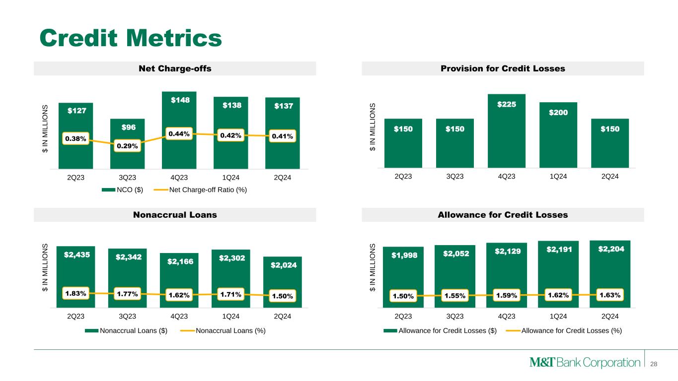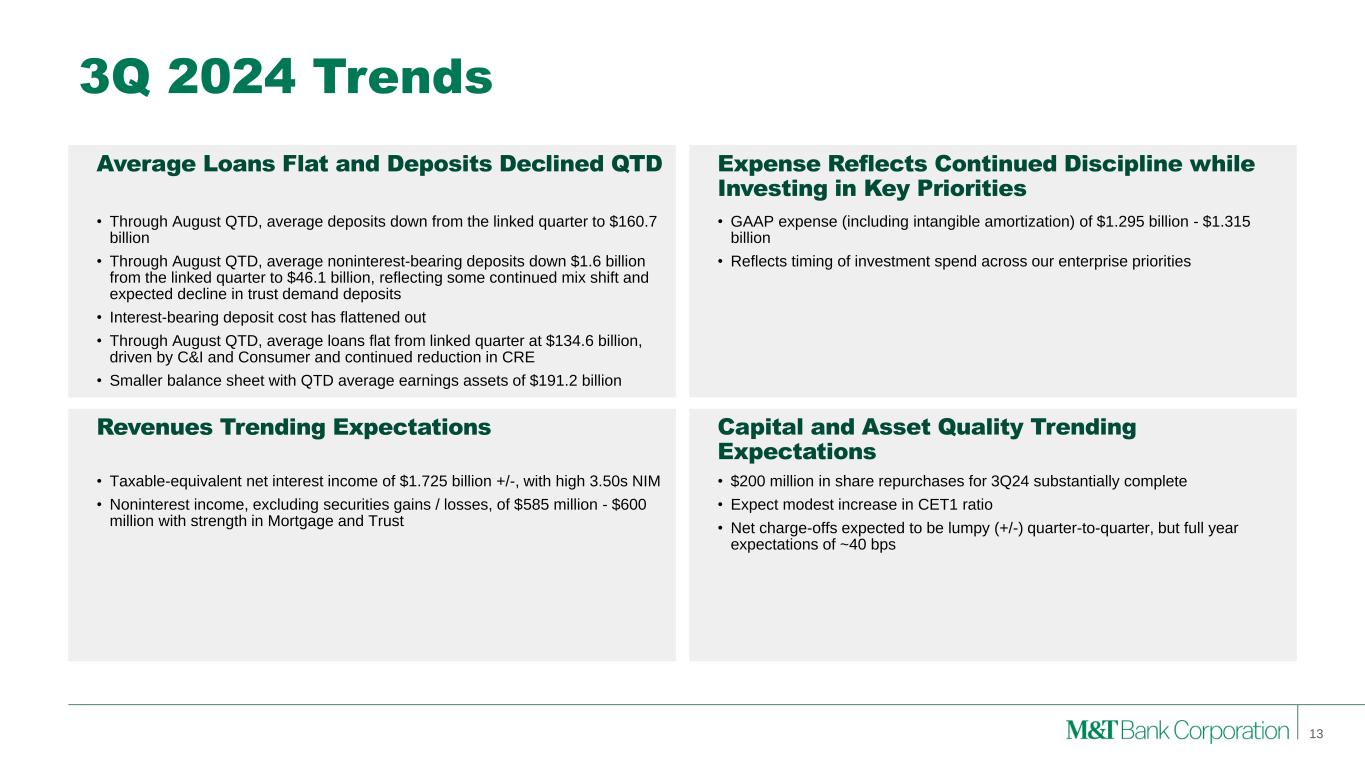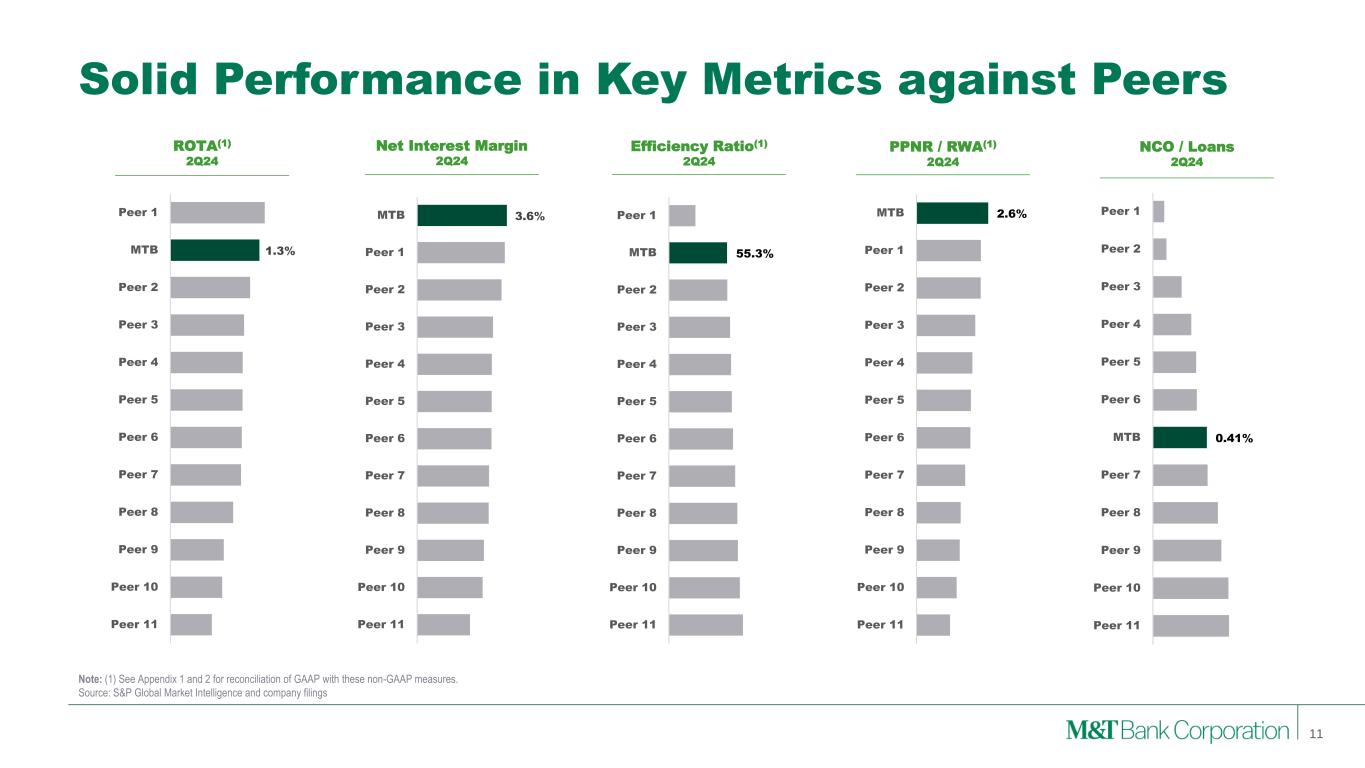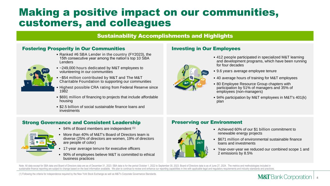 Disclaimer This presentation may contain forward-looking statements regarding M&T Bank Corporation (“M&T”) within the meaning of the Private Securities Litigation Reform Act of 1995 and the rules and regulations of the Securities and Exchange Commission (“SEC”). Any statement that does not describe historical or current facts is a forward-looking statement, including statements based on current expectations, estimates and projections about M&T's business, and management's beliefs and assumptions. Statements regarding the potential effects of events or factors specific to M&T and/or the financial industry as a whole, as well as national and global events generally, on M&T's business, financial condition, liquidity and results of operations may constitute forward-looking statements. Such statements are subject to the risk that the actual effects may differ, possibly materially, from what is reflected in those forward-looking statements due to factors and future developments that are uncertain, unpredictable and in many cases beyond M&T's control. Forward-looking statements are typically identified by words such as "believe," "expect," "anticipate," "intend," "target," "estimate," "continue," or "potential," by future conditional verbs such as "will," "would," "should," "could," or "may," or by variations of such words or by similar expressions. These statements are not guarantees of future performance and involve certain risks, uncertainties and assumptions which are difficult to predict and may cause actual outcomes to differ materially from what is expressed or forecasted. While there can be no assurance that any list of risks and uncertainties is complete, important factors that could cause actual outcomes and results to differ materially from those contemplated by forward-looking statements include the following, without limitation: economic conditions and growth rates, including inflation and market volatility; events and developments in the financial services industry, including industry conditions; changes in interest rates, spreads on earning assets and interest- bearing liabilities, and interest rate sensitivity; prepayment speeds, loan originations, loan concentrations by type and industry, credit losses and market values on loans, collateral securing loans, and other assets; sources of liquidity; levels of client deposits; ability to contain costs and expenses; changes in M&T’s credit ratings; the impact of the People’s United Financial, Inc. acquisition; domestic or international political developments and other geopolitical events, including international conflicts and hostilities; changes and trends in the securities markets; common shares outstanding and common stock price volatility; fair value of and number of stock-based compensation awards to be issued in future periods; the impact of changes in market values on trust-related revenues; federal, state or local legislation and/or regulations affecting the financial services industry, or M&T and its subsidiaries individually or collectively, including tax policy; regulatory supervision and oversight, including monetary policy and capital requirements; governmental and public policy changes; political conditions, either nationally or in the states in which M&T and its subsidiaries do business; the outcome of pending and future litigation and governmental proceedings, including tax-related examinations and other matters; changes in accounting policies or procedures as may be required by the Financial Accounting Standards Board, regulatory agencies or legislation; increasing price, product and service competition by competitors, including new entrants; technological developments and changes; the ability to continue to introduce competitive new products and services on a timely, cost-effective basis; the mix of products and services; protection and validity of intellectual property rights; reliance on large customers; technological, implementation and cost/financial risks in large, multi-year contracts; continued availability of financing; financial resources in the amounts, at the times and on the terms required to support M&T and its subsidiaries' future businesses; and material differences in the actual financial results of merger, acquisition, divestment and investment activities compared with M&T's initial expectations, including the full realization of anticipated cost savings and revenue enhancements. These are representative of the factors that could affect the outcome of the forward-looking statements. In addition, as noted, such statements could be affected by general industry and market conditions and growth rates, general economic and political conditions, either nationally or in the states in which M&T and its subsidiaries do business, and other factors. M&T provides further detail regarding these risks and uncertainties in its Form 10-K for the year ended December 31, 2023, including in the Risk Factors section of such report, as well as in other SEC filings. Forward-looking statements speak only as of the date they are made, and M&T assumes no duty and does not undertake to update forward-looking statements. Annualized, pro forma, projected, and estimated numbers are used for illustrative purposes only, are not forecasts and may not reflect actual results. This presentation also contains financial information and performance measures determined by methods other than in accordance with accounting principles generally accepted in the United States ("GAAP"). Management believes investors may find these non-GAAP financial measures useful. These disclosures should not be viewed as a substitute for financial measures determined in accordance with GAAP, nor are they necessarily comparable to non-GAAP performance measures that may be presented by other companies. Please see the Appendices for reconciliation of GAAP with corresponding non-GAAP measures, as indicated in the presentation. 2