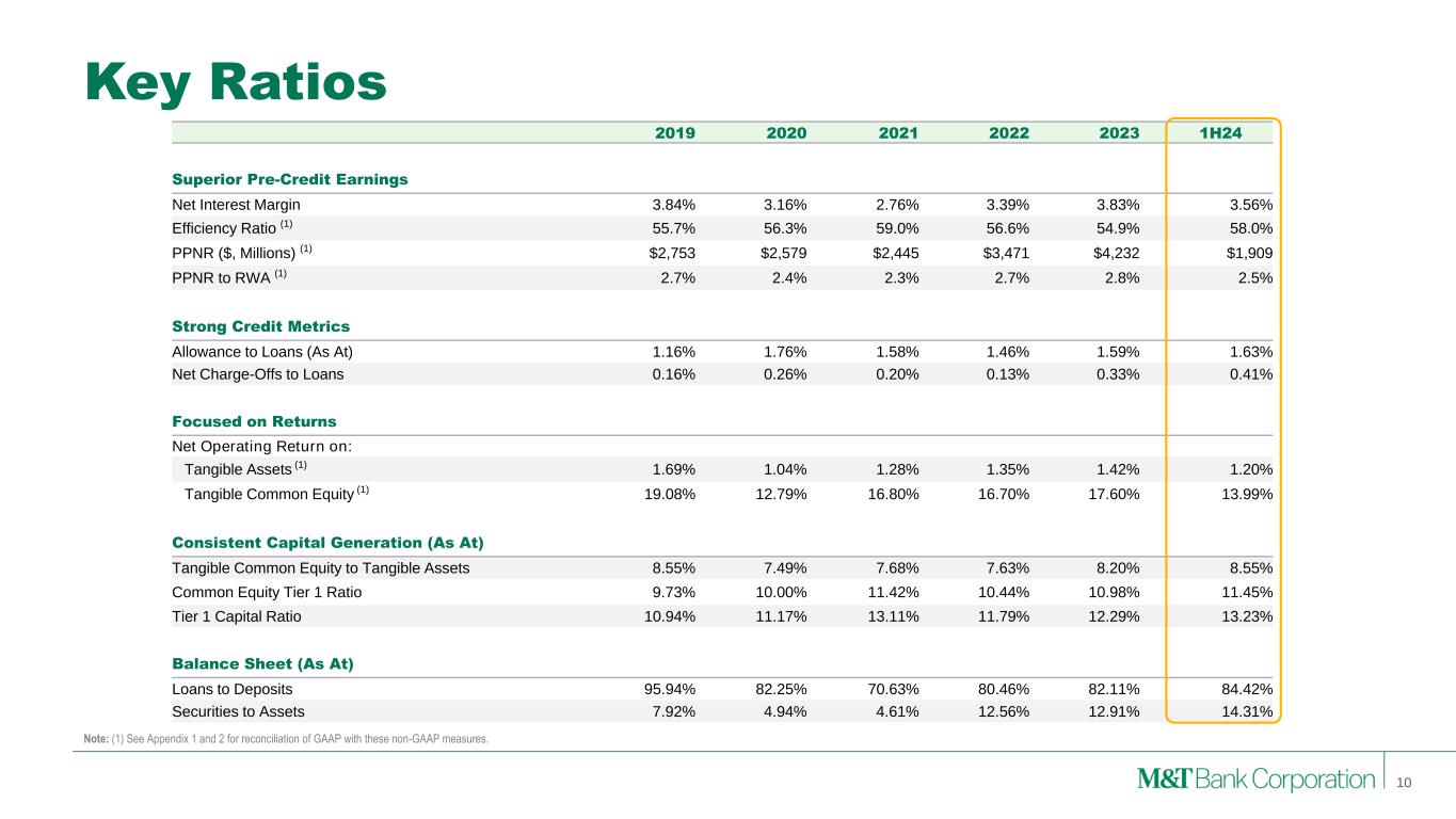 $21.97 $98.54 $- $20 $40 $60 $80 $100 $120 2003 2008 2013 2018 2023 $1.20 $5.20 $- $1 $2 $3 $4 $5 $6 2003 2008 2013 2018 2023 …Combined with Consistent Growth Dividend Per Share Tangible Book Value Per Share MTB: 7.6% CAGR Peer Median: 1.3%CAGR MTB: 7.8% CAGR Peer Median: 1.5% CAGR 10.5% 10.0% 11.9% 4.5% 7.3% 6.7% 20-Years YE03-YE23 10-Years YE13-YE23 5-Years YE18-YE23 CAGR – TBVPS Growth plus Dividends MTB Peer Median Consistently Delivering Value and Growth • Consistent dividend and TBVPS growth compared to peers • Results in higher than peer CAGR for TBVPS growth plus dividends over 5-, 10-, and 20-years Key Points 9