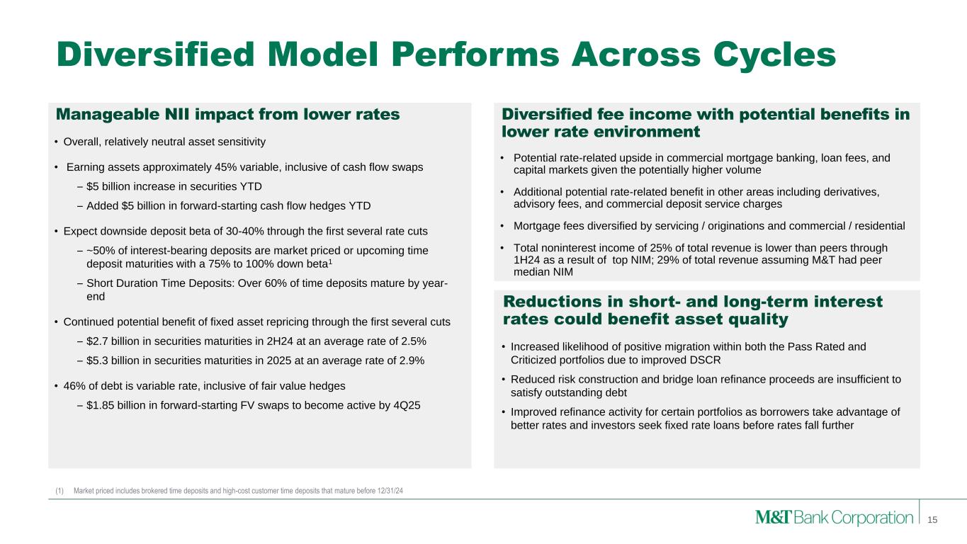 2024 Outlook Comments In c o m e S ta te m e n t Net Interest Income Taxable-equivalent $6.85 billion to $6.90 billion • NIM in the 3.50s • Reflects four rate cuts in remainder of the year • Range dependent on deposit trends and loan growth Fee Income $2.3 billion to $2.4 billion • Growth in trust, brokerage and service charges GAAP Expense Includes intangible amortization Excludes incremental FDIC special assessment $5.25 billion to $5.30 billion • Continued focus on managing expense, while investing in enterprise priorities Net Charge-Offs % of Average Loans ~40 basis points • NCO normalization in C&I and consumer loan portfolios Tax Rate Taxable-equivalent 24.0% to 24.5% • Excludes certain discrete tax benefit in 1Q24 A v e ra g e B a la n c e s Loans $134 billion to $136 billion • Growth in C&I and consumer, declines in CRE and residential mortgage Deposits $162 billion to $164 billion • Focus on growing customer deposits Share Repurchases $200 million per quarter in 3Q and 4Q24 • 3Q24 repurchases substantially complete • Expect to maintain capital ratios at least at current levels Preferred Dividends 3Q: ~$47 million 4Q: ~$36 million • Reflects Series J issuance in May and Series E redemption in August 2024 Outlook 14