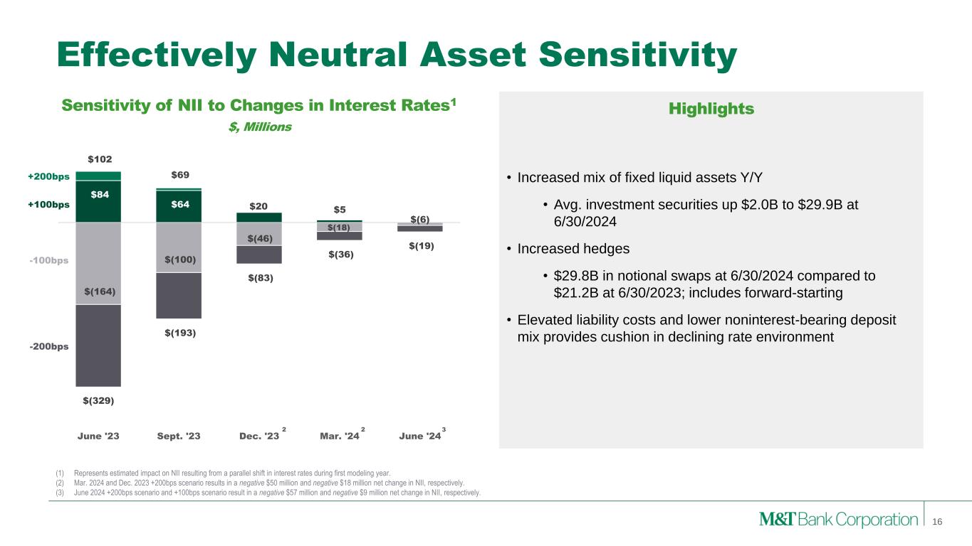 Diversified Model Performs Across Cycles 15 Manageable NII impact from lower rates Diversified fee income with potential benefits in lower rate environment Reductions in short- and long-term interest rates could benefit asset quality • Overall, relatively neutral asset sensitivity • Earning assets approximately 45% variable, inclusive of cash flow swaps – $5 billion increase in securities YTD – Added $5 billion in forward-starting cash flow hedges YTD • Expect downside deposit beta of 30-40% through the first several rate cuts – ~50% of interest-bearing deposits are market priced or upcoming time deposit maturities with a 75% to 100% down beta1 – Short Duration Time Deposits: Over 60% of time deposits mature by year- end • Continued potential benefit of fixed asset repricing through the first several cuts – $2.7 billion in securities maturities in 2H24 at an average rate of 2.5% – $5.3 billion in securities maturities in 2025 at an average rate of 2.9% • 46% of debt is variable rate, inclusive of fair value hedges – $1.85 billion in forward-starting FV swaps to become active by 4Q25 • Potential rate-related upside in commercial mortgage banking, loan fees, and capital markets given the potentially higher volume • Additional potential rate-related benefit in other areas including derivatives, advisory fees, and commercial deposit service charges • Mortgage fees diversified by servicing / originations and commercial / residential • Total noninterest income of 25% of total revenue is lower than peers through 1H24 as a result of top NIM; 29% of total revenue assuming M&T had peer median NIM • Increased likelihood of positive migration within both the Pass Rated and Criticized portfolios due to improved DSCR • Reduced risk construction and bridge loan refinance proceeds are insufficient to satisfy outstanding debt • Improved refinance activity for certain portfolios as borrowers take advantage of better rates and investors seek fixed rate loans before rates fall further (1) Market priced includes brokered time deposits and high-cost customer time deposits that mature before 12/31/24