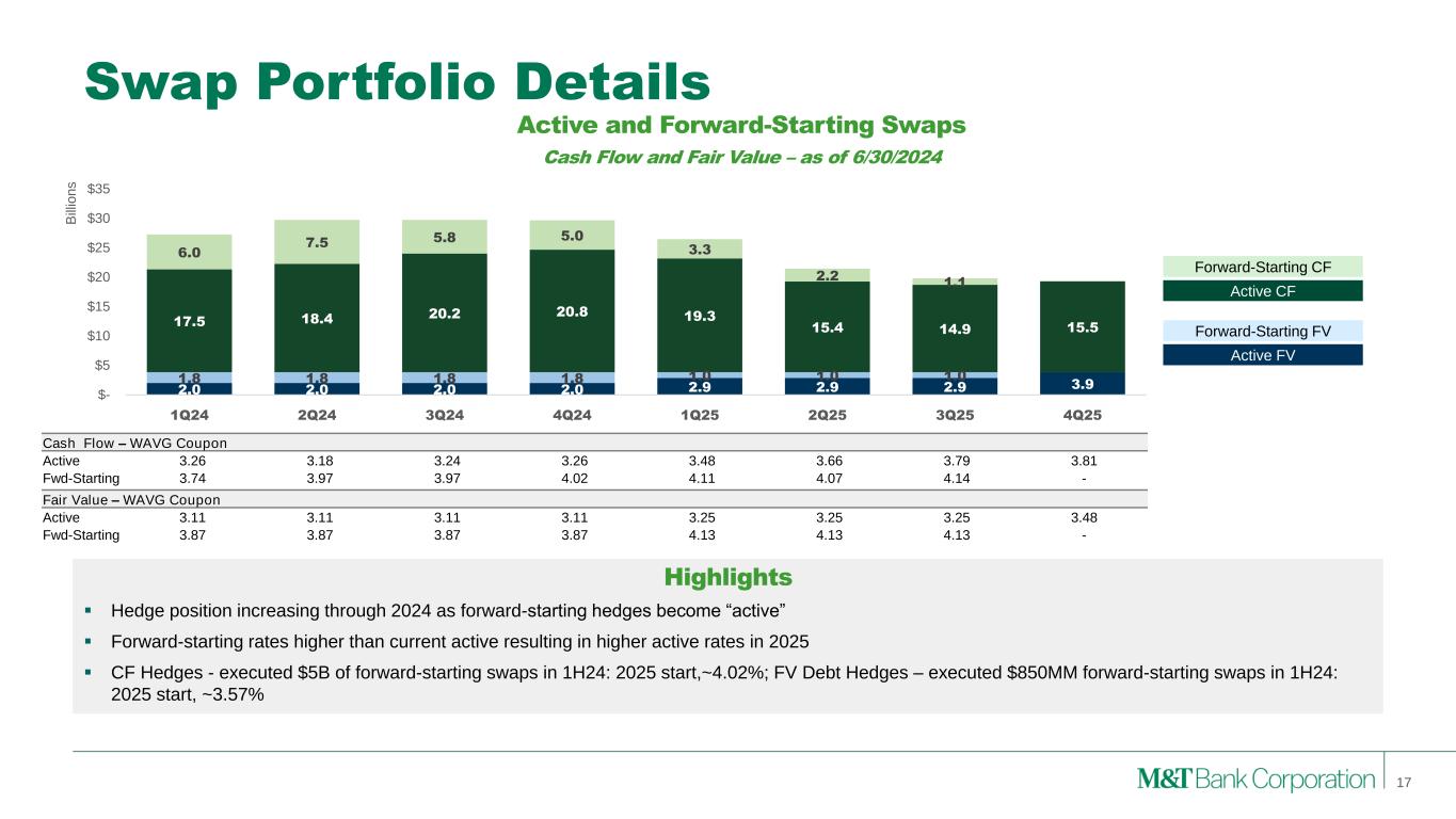$(6) $102 $69 $84 $64 $20 $5 $(164) $(100) $(46) $(18) $(329) $(193) $(83) $(36) $(19) June '23 Sept. '23 Dec. '23 Mar. '24 June '24 Effectively Neutral Asset Sensitivity (1) Represents estimated impact on NII resulting from a parallel shift in interest rates during first modeling year. (2) Mar. 2024 and Dec. 2023 +200bps scenario results in a negative $50 million and negative $18 million net change in NII, respectively. (3) June 2024 +200bps scenario and +100bps scenario result in a negative $57 million and negative $9 million net change in NII, respectively. Sensitivity of NII to Changes in Interest Rates1 $, Millions • Increased mix of fixed liquid assets Y/Y • Avg. investment securities up $2.0B to $29.9B at 6/30/2024 • Increased hedges • $29.8B in notional swaps at 6/30/2024 compared to $21.2B at 6/30/2023; includes forward-starting • Elevated liability costs and lower noninterest-bearing deposit mix provides cushion in declining rate environment Highlights 16 +200bps +100bps -100bps -200bps 2 32