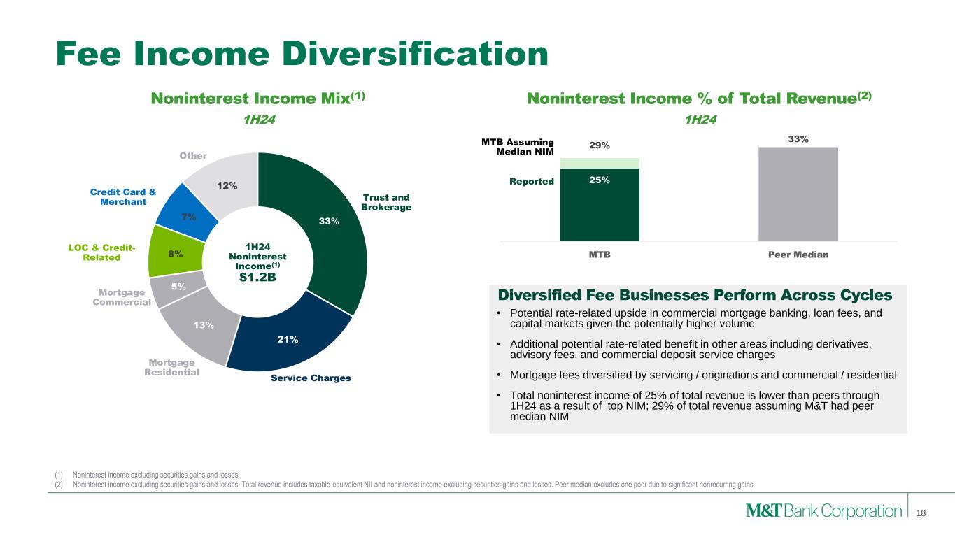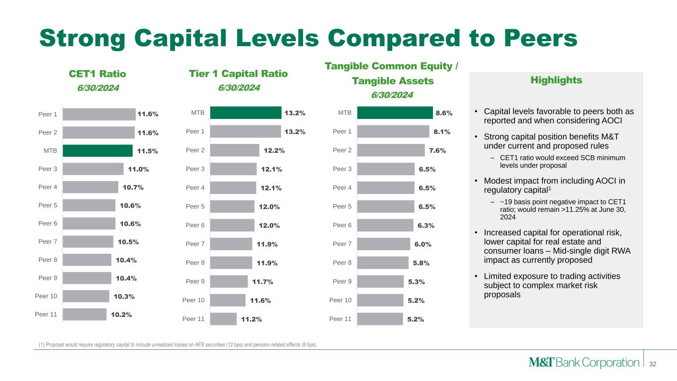 5.2% 5.2% 5.3% 5.8% 6.0% 6.3% 6.5% 6.5% 6.5% 7.6% 8.1% 8.6% Peer 11 Peer 10 Peer 9 Peer 8 Peer 7 Peer 6 Peer 5 Peer 4 Peer 3 Peer 2 Peer 1 MTB Strong Capital Levels Compared to Peers • Capital levels favorable to peers both as reported and when considering AOCI • Strong capital position benefits M&T under current and proposed rules – CET1 ratio would exceed SCB minimum levels under proposal • Modest impact from including AOCI in regulatory capital1 – ~19 basis point negative impact to CET1 ratio; would remain >11.25% at June 30, 2024 • Increased capital for operational risk, lower capital for real estate and consumer loans – Mid-single digit RWA impact as currently proposed • Limited exposure to trading activities subject to complex market risk proposals (1) Proposal would require regulatory capital to include unrealized losses on AFS securities (12 bps) and pension-related effects (8 bps). CET1 Ratio 6/30/2024 Tangible Common Equity / Tangible Assets 6/30/2024 Highlights 32 Tier 1 Capital Ratio 6/30/2024 10.2% 10.3% 10.4% 10.4% 10.5% 10.6% 10.6% 10.7% 11.0% 11.5% 11.6% 11.6% Peer 11 Peer 10 Peer 9 Peer 8 Peer 7 Peer 6 Peer 5 Peer 4 Peer 3 MTB Peer 2 Peer 1 11.2% 11.6% 11.7% 11.9% 11.9% 12.0% 12.0% 12.1% 12.1% 12.2% 13.2% 13.2% Peer 11 Peer 10 Peer 9 Peer 8 Peer 7 Peer 6 Peer 5 Peer 4 Peer 3 Peer 2 Peer 1 MTB
