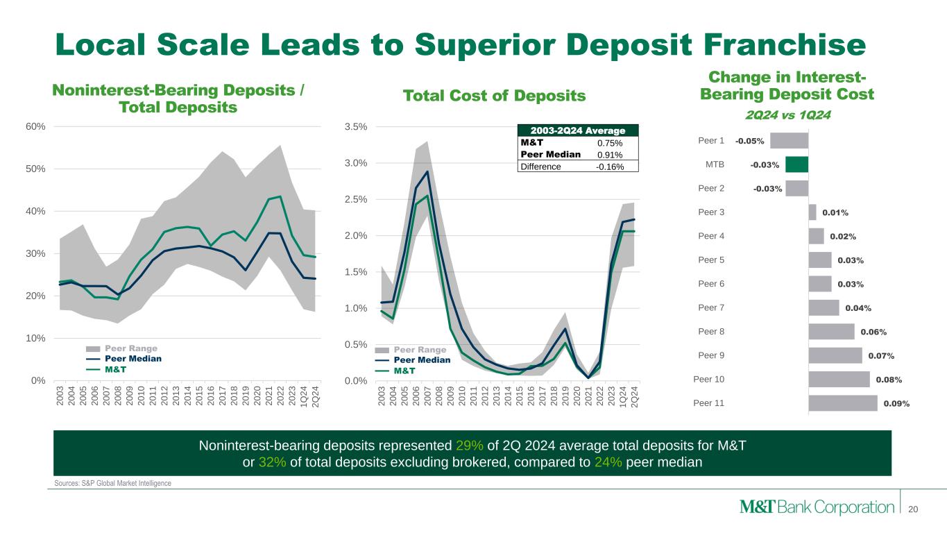 0.09% 0.08% 0.07% 0.06% 0.04% 0.03% 0.03% 0.02% 0.01% -0.03% -0.03% -0.05% Peer 11 Peer 10 Peer 9 Peer 8 Peer 7 Peer 6 Peer 5 Peer 4 Peer 3 Peer 2 MTB Peer 1 0.0% 0.5% 1.0% 1.5% 2.0% 2.5% 3.0% 3.5% 2 0 0 3 2 0 0 4 2 0 0 5 2 0 0 6 2 0 0 7 2 0 0 8 2 0 0 9 2 0 1 0 2 0 1 1 2 0 1 2 2 0 1 3 2 0 1 4 2 0 1 5 2 0 1 6 2 0 1 7 2 0 1 8 2 0 1 9 2 0 2 0 2 0 2 1 2 0 2 2 2 0 2 3 1 Q 2 4 2 Q 2 4 0% 10% 20% 30% 40% 50% 60% 2 0 0 3 2 0 0 4 2 0 0 5 2 0 0 6 2 0 0 7 2 0 0 8 2 0 0 9 2 0 1 0 2 0 1 1 2 0 1 2 2 0 1 3 2 0 1 4 2 0 1 5 2 0 1 6 2 0 1 7 2 0 1 8 2 0 1 9 2 0 2 0 2 0 2 1 2 0 2 2 2 0 2 3 1 Q 2 4 2 Q 2 4 Sources: S&P Global Market Intelligence Local Scale Leads to Superior Deposit Franchise Noninterest-bearing deposits represented 29% of 2Q 2024 average total deposits for M&T or 32% of total deposits excluding brokered, compared to 24% peer median 2003-2Q24 Average M&T 0.75% Peer Median 0.91% Difference -0.16% Noninterest-Bearing Deposits / Total Deposits Total Cost of Deposits 20 M&T Peer Median Peer Range Change in Interest- Bearing Deposit Cost 2Q24 vs 1Q24 M&T Peer Median Peer Range
