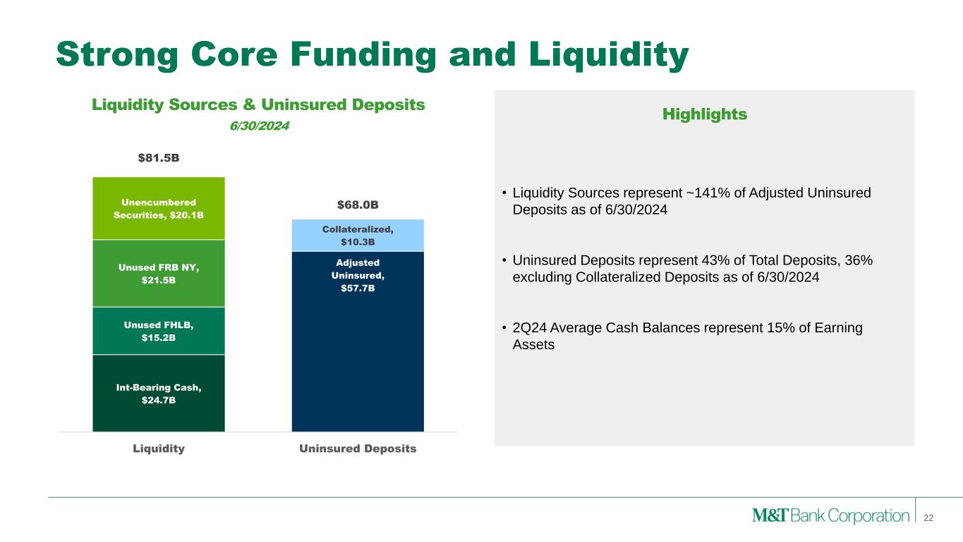 Retail Bank $92.3B Commercial Bank $43.0B Inst. Svcs. & Wealth Mgmt. $17.3B All Other $11.0B Diversified and Granular Deposit Base • Diversified across industries and geographies • Average relationship tenure of 16 years • Average account size $4MM; median $378k • ~62% operating balances Average Deposits 2Q24 Institutional Services & Wealth Management Retail Bank Commercial Bank • Consists primarily of Consumer and Business Banking • Deposits are spread across our 900+ branch network, spanning 12 states and Washington, DC • Consumer ($68B): Average relationship tenure of 16 years; Average account size $15k • Business Banking ($21B): Average relationship tenure of 13 years; Average account size $55k; ~43% operating balances • Other Businesses ($3B): Primarily Mortgage • Consists primarily of Wealth and Institutional Services deposits • Wealth Management ($4B): Average relationship tenure of 17 years; Average account size ~$164k • Institutional Services ($13B): Average account size ~$1MM 21 $163B All Other • Consists primarily of brokered deposits