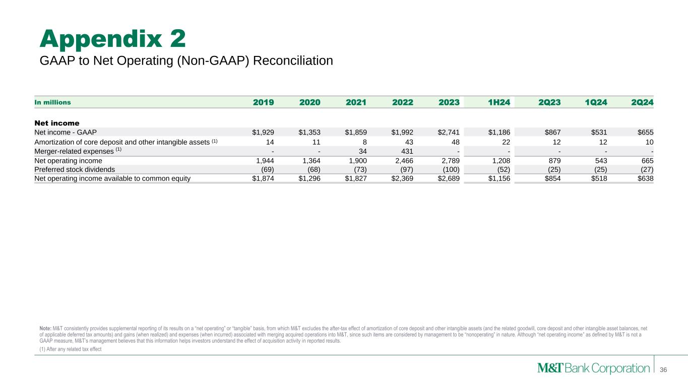 Appendix 1 Note: M&T is providing supplemental reporting of its results on a “GAAP – Adjusted” basis, from which M&T excludes the after-tax effect of certain notable items of significance. Although “GAAP – Adjusted” income as presented by M&T is not a GAAP measure, M&T management believes that this information helps investors understand the effect of such notable items in reported results. Tables in appendices may not foot due to rounding. GAAP to GAAP - Adjusted (Non-GAAP) Reconciliation 35 In millions 2019 2020 2021 2022 2023 1H24 2Q23 1Q24 2Q24 Revenues Net interest income - GAAP $4,130 $3,866 $3,825 $5,822 $7,115 $3,398 $1,799 $1,680 $1,718 Total other income - GAAP 2,062 2,088 2,167 2,357 2,528 1,164 803 580 584 Subtotal 6,192 5,955 5,992 8,179 9,643 4,562 2,602 2,260 2,302 Gain on CIT - - - - (225) - (225) - - Gain on MTIA - - - (136) - - - - - Revenues - GAAP Adjusted $6,192 $5,955 $5,992 $8,042 $9,418 $4,562 $2,378 $2,260 $2,302 Noninterest expense Noninterest expense - GAAP $3,469 $3,385 $3,612 $5,050 $5,379 $2,693 $1,293 $1,396 $1,297 FDIC special assessment - - - - (197) (34) - (29) (5) Write-down of equity method investment (48) - - - - - - - - Charitable contribution - - - (135) - - - - - Merger-related expense - - (44) (338) - - - - - Noninterest expense - GAAP Adjusted $3,420 $3,385 $3,568 $4,577 $5,182 $2,659 $1,293 $1,367 $1,292 PPNR Revenues - GAAP Adjusted $6,192 $5,955 $5,992 $8,042 $9,418 $4,562 $2,378 $2,260 $2,302 (Gain) loss on bank investment securities (18) 9 21 6 (4) 6 (1) (2) 8 Noninterest expense - GAAP Adjusted (3,420) (3,385) (3,568) (4,577) (5,182) (2,659) (1,293) (1,367) (1,292) Pre-provision net revenue $2,753 $2,579 $2,445 $3,471 $4,232 $1,909 $1,084 $891 $1,018