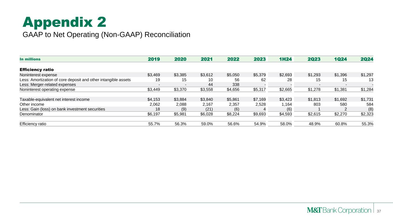 Appendix 2 GAAP to Net Operating (Non-GAAP) Reconciliation 37 In millions 2019 2020 2021 2022 2023 1H24 2Q23 1Q24 2Q24 Efficiency ratio Noninterest expense $3,469 $3,385 $3,612 $5,050 $5,379 $2,693 $1,293 $1,396 $1,297 Less: Amortization of core deposit and other intangible assets 19 15 10 56 62 28 15 15 13 Less: Merger-related expenses - - 44 338 - - - - - Noninterest operating expense $3,449 $3,370 $3,558 $4,656 $5,317 $2,665 $1,278 $1,381 $1,284 Taxable-equivalent net interest income $4,153 $3,884 $3,840 $5,861 $7,169 $3,423 $1,813 $1,692 $1,731 Other income 2,062 2,088 2,167 2,357 2,528 1,164 803 580 584 Less: Gain (loss) on bank investment securities 18 (9) (21) (6) 4 (6) 1 2 (8) Denominator $6,197 $5,981 $6,028 $8,224 $9,693 $4,593 $2,615 $2,270 $2,323 Efficiency ratio 55.7% 56.3% 59.0% 56.6% 54.9% 58.0% 48.9% 60.8% 55.3%