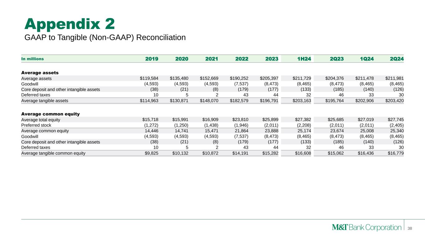 Appendix 2 Note: M&T consistently provides supplemental reporting of its results on a “net operating” or “tangible” basis, from which M&T excludes the after-tax effect of amortization of core deposit and other intangible assets (and the related goodwill, core deposit and other intangible asset balances, net of applicable deferred tax amounts) and gains (when realized) and expenses (when incurred) associated with merging acquired operations into M&T, since such items are considered by management to be “nonoperating” in nature. Although “net operating income” as defined by M&T is not a GAAP measure, M&T’s management believes that this information helps investors understand the effect of acquisition activity in reported results. (1) After any related tax effect 36 In millions 2019 2020 2021 2022 2023 1H24 2Q23 1Q24 2Q24 Net income Net income - GAAP $1,929 $1,353 $1,859 $1,992 $2,741 $1,186 $867 $531 $655 Amortization of core deposit and other intangible assets (1) 14 11 8 43 48 22 12 12 10 Merger-related expenses (1) - - 34 431 - - - - - Net operating income 1,944 1,364 1,900 2,466 2,789 1,208 879 543 665 Preferred stock dividends (69) (68) (73) (97) (100) (52) (25) (25) (27) Net operating income available to common equity $1,874 $1,296 $1,827 $2,369 $2,689 $1,156 $854 $518 $638 GAAP to Net Operating (Non-GAAP) Reconciliation