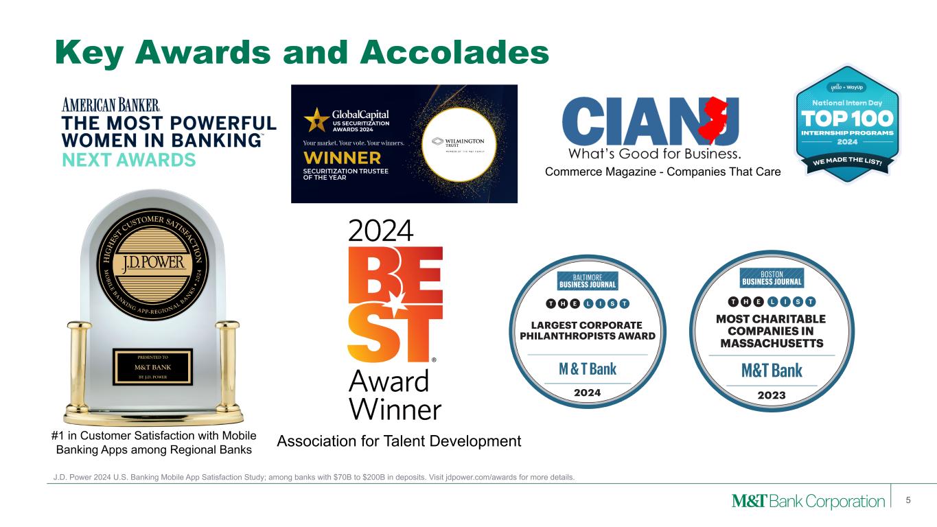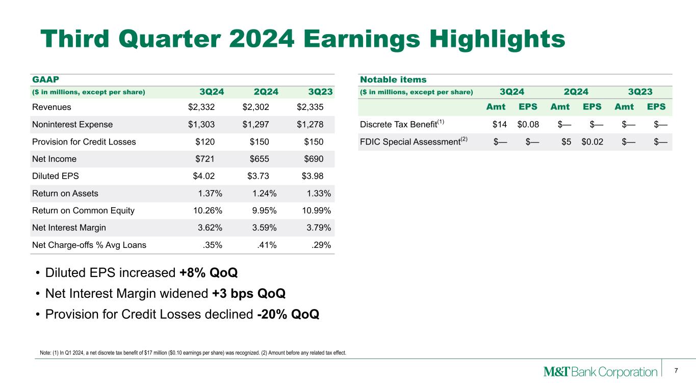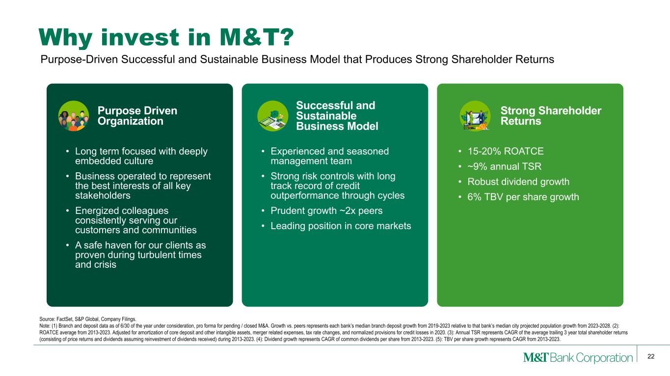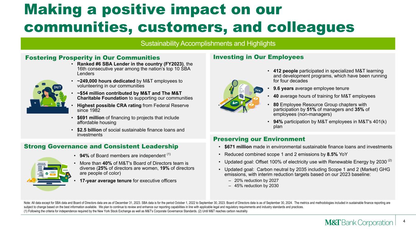 2 This presentation may contain forward-looking statements regarding M&T Bank Corporation (“M&T”) within the meaning of the Private Securities Litigation Reform Act of 1995 and the rules and regulations of the Securities and Exchange Commission (“SEC”). Any statement that does not describe historical or current facts is a forward-looking statement, including statements based on current expectations, estimates and projections about M&T's business, and management's beliefs and assumptions. Statements regarding the potential effects of events or factors specific to M&T and/or the financial industry as a whole, as well as national and global events generally, on M&T's business, financial condition, liquidity and results of operations may constitute forward-looking statements. Such statements are subject to the risk that the actual effects may differ, possibly materially, from what is reflected in those forward-looking statements due to factors and future developments that are uncertain, unpredictable and in many cases beyond M&T's control. Forward-looking statements are typically identified by words such as "believe," "expect," "anticipate," "intend," "target," "estimate," "continue," or "potential," by future conditional verbs such as "will," "would," "should," "could," or "may," or by variations of such words or by similar expressions. These statements are not guarantees of future performance and involve certain risks, uncertainties and assumptions which are difficult to predict and may cause actual outcomes to differ materially from what is expressed or forecasted. While there can be no assurance that any list of risks and uncertainties is complete, important factors that could cause actual outcomes and results to differ materially from those contemplated by forward-looking statements include the following, without limitation: economic conditions and growth rates, including inflation and market volatility; events and developments in the financial services industry, including industry conditions; changes in interest rates, spreads on earning assets and interest-bearing liabilities, and interest rate sensitivity; prepayment speeds, loan originations, loan concentrations by type and industry, credit losses and market values on loans, collateral securing loans, and other assets; sources of liquidity; levels of client deposits; ability to contain costs and expenses; changes in M&T’s credit ratings; the impact of the People’s United Financial, Inc. acquisition; domestic or international political developments and other geopolitical events, including international conflicts and hostilities; changes and trends in the securities markets; common shares outstanding and common stock price volatility; fair value of and number of stock-based compensation awards to be issued in future periods; the impact of changes in market values on trust-related revenues; federal, state or local legislation and/or regulations affecting the financial services industry, or M&T and its subsidiaries individually or collectively, including tax policy; regulatory supervision and oversight, including monetary policy and capital requirements; governmental and public policy changes; political conditions, either nationally or in the states in which M&T and its subsidiaries do business; the outcome of pending and future litigation and governmental proceedings, including tax-related examinations and other matters; changes in accounting policies or procedures as may be required by the Financial Accounting Standards Board, regulatory agencies or legislation; increasing price, product and service competition by competitors, including new entrants; technological developments and changes; the ability to continue to introduce competitive new products and services on a timely, cost-effective basis; the mix of products and services; protection and validity of intellectual property rights; reliance on large customers; technological, implementation and cost/financial risks in large, multi-year contracts; continued availability of financing; financial resources in the amounts, at the times and on the terms required to support M&T and its subsidiaries' future businesses; and material differences in the actual financial results of merger, acquisition, divestment and investment activities compared with M&T's initial expectations, including the full realization of anticipated cost savings and revenue enhancements. These are representative of the factors that could affect the outcome of the forward-looking statements. In addition, as noted, such statements could be affected by general industry and market conditions and growth rates, general economic and political conditions, either nationally or in the states in which M&T and its subsidiaries do business, and other factors. M&T provides further detail regarding these risks and uncertainties in its Form 10-K for the year ended December 31, 2023, including in the Risk Factors section of such report, as well as in other SEC filings. Forward-looking statements speak only as of the date they are made, and M&T assumes no duty and does not undertake to update forward-looking statements. Annualized, pro forma, projected, and estimated numbers are used for illustrative purposes only, are not forecasts and may not reflect actual results. This presentation also contains financial information and performance measures determined by methods other than in accordance with accounting principles generally accepted in the United States ("GAAP"). Management believes investors may find these non-GAAP financial measures useful. These disclosures should not be viewed as a substitute for financial measures determined in accordance with GAAP, nor are they necessarily comparable to non-GAAP performance measures that may be presented by other companies. Please see the Appendix for reconciliation of GAAP with corresponding non- GAAP measures, as indicated in the presentation. Forward-Looking Statements and Non