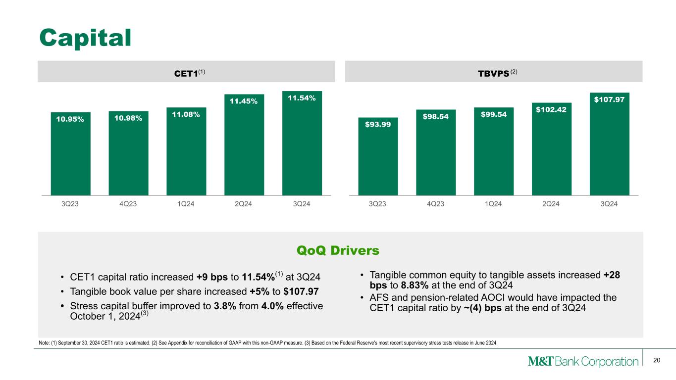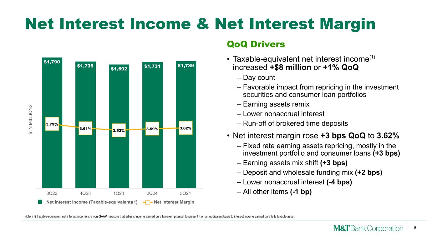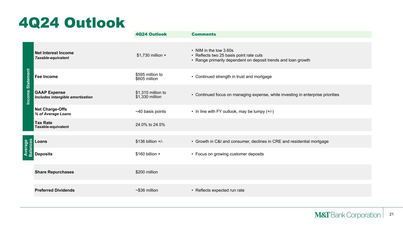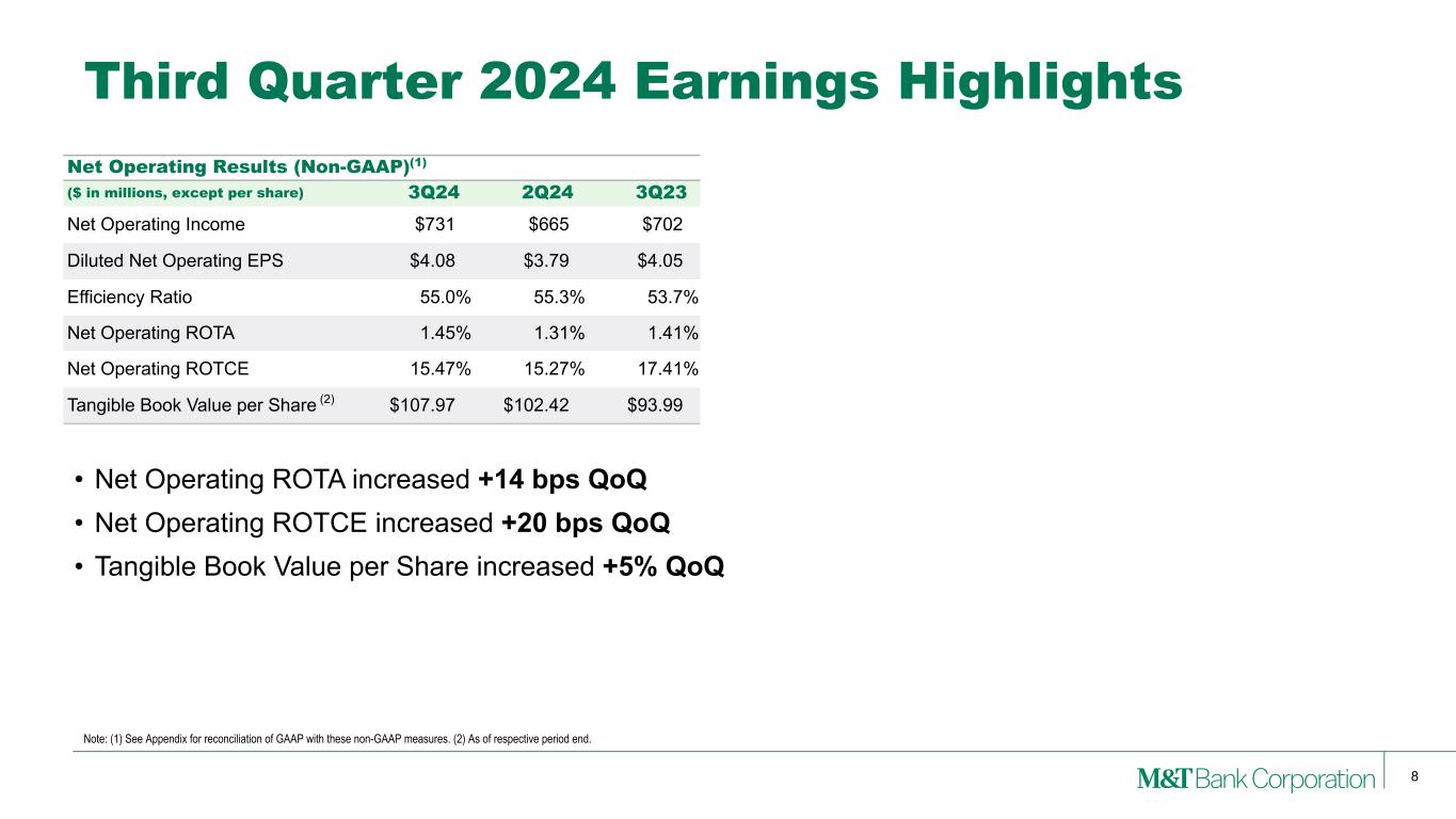 2 This presentation may contain forward-looking statements regarding M&T Bank Corporation (“M&T”) within the meaning of the Private Securities Litigation Reform Act of 1995 and the rules and regulations of the Securities and Exchange Commission (“SEC”). Any statement that does not describe historical or current facts is a forward-looking statement, including statements based on current expectations, estimates and projections about M&T's business, and management's beliefs and assumptions. Statements regarding the potential effects of events or factors specific to M&T and/or the financial industry as a whole, as well as national and global events generally, on M&T's business, financial condition, liquidity and results of operations may constitute forward-looking statements. Such statements are subject to the risk that the actual effects may differ, possibly materially, from what is reflected in those forward-looking statements due to factors and future developments that are uncertain, unpredictable and in many cases beyond M&T's control. Forward-looking statements are typically identified by words such as "believe," "expect," "anticipate," "intend," "target," "estimate," "continue," or "potential," by future conditional verbs such as "will," "would," "should," "could," or "may," or by variations of such words or by similar expressions. These statements are not guarantees of future performance and involve certain risks, uncertainties and assumptions which are difficult to predict and may cause actual outcomes to differ materially from what is expressed or forecasted. While there can be no assurance that any list of risks and uncertainties is complete, important factors that could cause actual outcomes and results to differ materially from those contemplated by forward-looking statements include the following, without limitation: economic conditions and growth rates, including inflation and market volatility; events and developments in the financial services industry, including industry conditions; changes in interest rates, spreads on earning assets and interest-bearing liabilities, and interest rate sensitivity; prepayment speeds, loan originations, loan concentrations by type and industry, credit losses and market values on loans, collateral securing loans, and other assets; sources of liquidity; levels of client deposits; ability to contain costs and expenses; changes in M&T’s credit ratings; the impact of the People’s United Financial, Inc. acquisition; domestic or international political developments and other geopolitical events, including international conflicts and hostilities; changes and trends in the securities markets; common shares outstanding and common stock price volatility; fair value of and number of stock-based compensation awards to be issued in future periods; the impact of changes in market values on trust-related revenues; federal, state or local legislation and/or regulations affecting the financial services industry, or M&T and its subsidiaries individually or collectively, including tax policy; regulatory supervision and oversight, including monetary policy and capital requirements; governmental and public policy changes; political conditions, either nationally or in the states in which M&T and its subsidiaries do business; the outcome of pending and future litigation and governmental proceedings, including tax-related examinations and other matters; changes in accounting policies or procedures as may be required by the Financial Accounting Standards Board, regulatory agencies or legislation; increasing price, product and service competition by competitors, including new entrants; technological developments and changes; the ability to continue to introduce competitive new products and services on a timely, cost-effective basis; the mix of products and services; protection and validity of intellectual property rights; reliance on large customers; technological, implementation and cost/financial risks in large, multi-year contracts; continued availability of financing; financial resources in the amounts, at the times and on the terms required to support M&T and its subsidiaries' future businesses; and material differences in the actual financial results of merger, acquisition, divestment and investment activities compared with M&T's initial expectations, including the full realization of anticipated cost savings and revenue enhancements. These are representative of the factors that could affect the outcome of the forward-looking statements. In addition, as noted, such statements could be affected by general industry and market conditions and growth rates, general economic and political conditions, either nationally or in the states in which M&T and its subsidiaries do business, and other factors. M&T provides further detail regarding these risks and uncertainties in its Form 10-K for the year ended December 31, 2023, including in the Risk Factors section of such report, as well as in other SEC filings. Forward-looking statements speak only as of the date they are made, and M&T assumes no duty and does not undertake to update forward-looking statements. Annualized, pro forma, projected, and estimated numbers are used for illustrative purposes only, are not forecasts and may not reflect actual results. This presentation also contains financial information and performance measures determined by methods other than in accordance with accounting principles generally accepted in the United States ("GAAP"). Management believes investors may find these non-GAAP financial measures useful. These disclosures should not be viewed as a substitute for financial measures determined in accordance with GAAP, nor are they necessarily comparable to non-GAAP performance measures that may be presented by other companies. Please see the Appendix for reconciliation of GAAP with corresponding non- GAAP measures, as indicated in the presentation. Forward-Looking Statements and Non