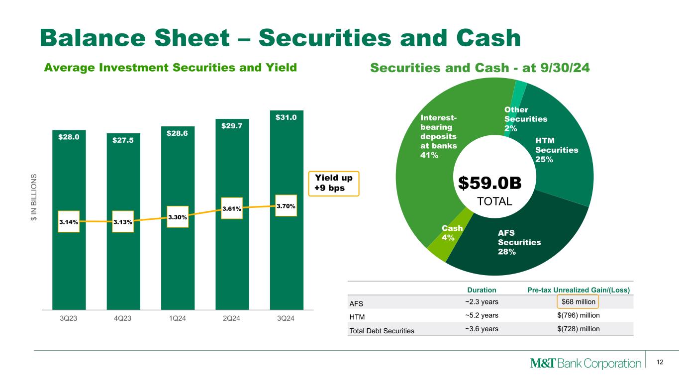 11 Balance Sheet – Average Loans QoQ Drivers Average loans +$163 million or less than +1% QoQ: • C&I loans increased +3% (+$1.6 billion), driven by continued growth spanning most industry types • CRE loans declined -8% (-$2.4 billion), reflecting continued low origination activity and paydowns as we continue to manage our CRE loan concentration, which approximated 148% of Tier 1 capital plus allowable allowance for credit losses at 9/30/2024 • Consumer loans rose +4% (+$931 million), driven by sustained growth in recreational finance and automobile loans $ IN B IL LI O N S $54.5 $55.4 $56.8 $58.1 $59.8 $34.3 $33.5 $32.7 $31.5 $29.1 $23.6 $23.3 $23.1 $23.0 $23.0 $20.2 $20.6 $21.2 $22.0 $22.9 $132.6 $132.8 $133.8 $134.6 $134.8 6.19% 6.33% 6.32% 6.38% 6.38% C&I CRE Residential Mortgage Consumer Total Loans Total Loan Yield 3Q23 4Q23 1Q24 2Q24 3Q24