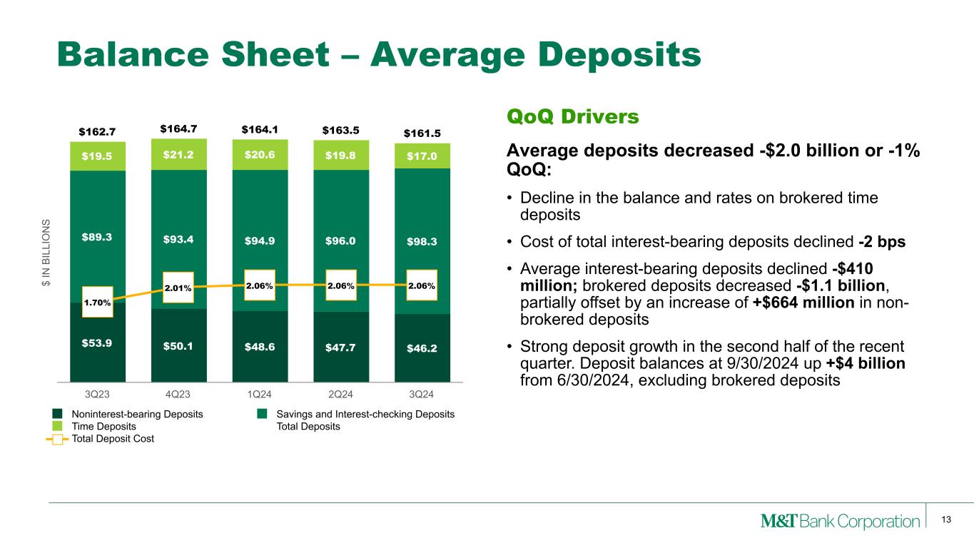12 Balance Sheet – Securities and Cash Duration Pre-tax Unrealized Gain/(Loss) AFS ~2.3 years $68 million HTM ~5.2 years $(796) million Total Debt Securities ~3.6 years $(728) million $ IN B IL LI O N S Average Investment Securities and Yield $28.0 $27.5 $28.6 $29.7 $31.0 3.14% 3.13% 3.30% 3.61% 3.70% 3Q23 4Q23 1Q24 2Q24 3Q24 Cash 4% Interest- bearing deposits at banks 41% Other Securities 2% HTM Securities 25% AFS Securities 28% $59.0B TOTAL Yield up +9 bps Securities and Cash - at 9/30/24