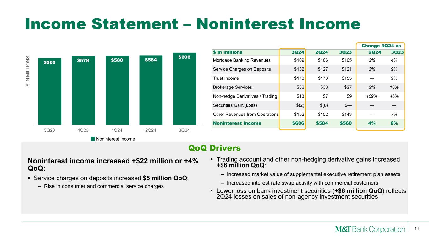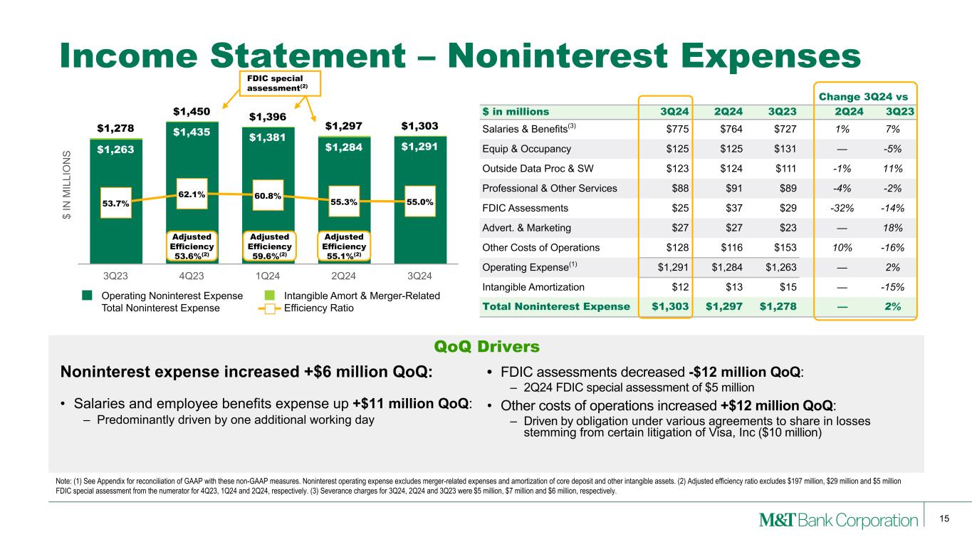 14 $ IN M IL LI O N S $560 $578 $580 $584 $606 Noninterest Income 3Q23 4Q23 1Q24 2Q24 3Q24 Change 3Q24 vs $ in millions 3Q24 2Q24 3Q23   2Q24 3Q23 Mortgage Banking Revenues $109 $106 $105 3% 4% Service Charges on Deposits $132 $127 $121 3% 9% Trust Income $170 $170 $155 — 9% Brokerage Services $32 $30 $27 2% 16% Non-hedge Derivatives / Trading $13 $7 $9 109% 46% Securities Gain/(Loss) $(2) $(8) $— — — Other Revenues from Operations $152 $152 $143 — 7% Noninterest Income $606 $584 $560   4% 8% Income Statement – Noninterest Income Noninterest income increased +$22 million or +4% QoQ: • Service charges on deposits increased $5 million QoQ: – Rise in consumer and commercial service charges • Trading account and other non-hedging derivative gains increased +$6 million QoQ: – Increased market value of supplemental executive retirement plan assets – Increased interest rate swap activity with commercial customers • Lower loss on bank investment securities (+$6 million QoQ) reflects 2Q24 losses on sales of non-agency investment securities QoQ Drivers