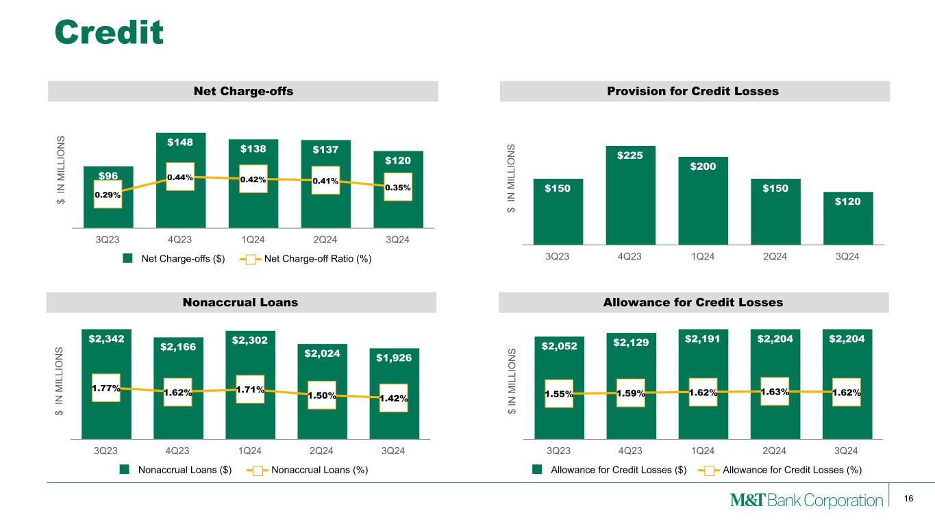 15 Change 3Q24 vs $ in millions 3Q24 2Q24 3Q23 2Q24 3Q23 Salaries & Benefits(3) $775 $764 $727 1% 7% Equip & Occupancy $125 $125 $131 — -5% Outside Data Proc & SW $123 $124 $111 -1% 11% Professional & Other Services $88 $91 $89 -4% -2% FDIC Assessments $25 $37 $29 -32% -14% Advert. & Marketing $27 $27 $23 — 18% Other Costs of Operations $128 $116 $153 10% -16% Operating Expense(1) $1,291 $1,284 $1,263 — 2% Intangible Amortization $12 $13 $15 — -15% Total Noninterest Expense $1,303 $1,297 $1,278   — 2% Income Statement – Noninterest Expenses Noninterest expense increased +$6 million QoQ: • Salaries and employee benefits expense up +$11 million QoQ: – Predominantly driven by one additional working day • FDIC assessments decreased -$12 million QoQ: – 2Q24 FDIC special assessment of $5 million • Other costs of operations increased +$12 million QoQ: – Driven by obligation under various agreements to share in losses stemming from certain litigation of Visa, Inc ($10 million) Note: (1) See Appendix for reconciliation of GAAP with these non-GAAP measures. Noninterest operating expense excludes merger-related expenses and amortization of core deposit and other intangible assets. (2) Adjusted efficiency ratio excludes $197 million, $29 million and $5 million FDIC special assessment from the numerator for 4Q23, 1Q24 and 2Q24, respectively. (3) Severance charges for 3Q24, 2Q24 and 3Q23 were $5 million, $7 million and $6 million, respectively. QoQ Drivers $ IN M IL LI O N S $1,263 $1,435 $1,381 $1,284 $1,291 $1,278 $1,450 $1,396 $1,297 $1,303 53.7% 62.1% 60.8% 55.3% 55.0% Operating Noninterest Expense Intangible Amort & Merger-Related Total Noninterest Expense Efficiency Ratio 3Q23 4Q23 1Q24 2Q24 3Q24 Adjusted Efficiency 59.6%(2) Adjusted Efficiency 53.6%(2) Adjusted Efficiency 55.1%(2) FDIC special assessment(2)