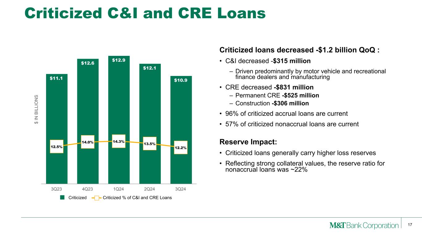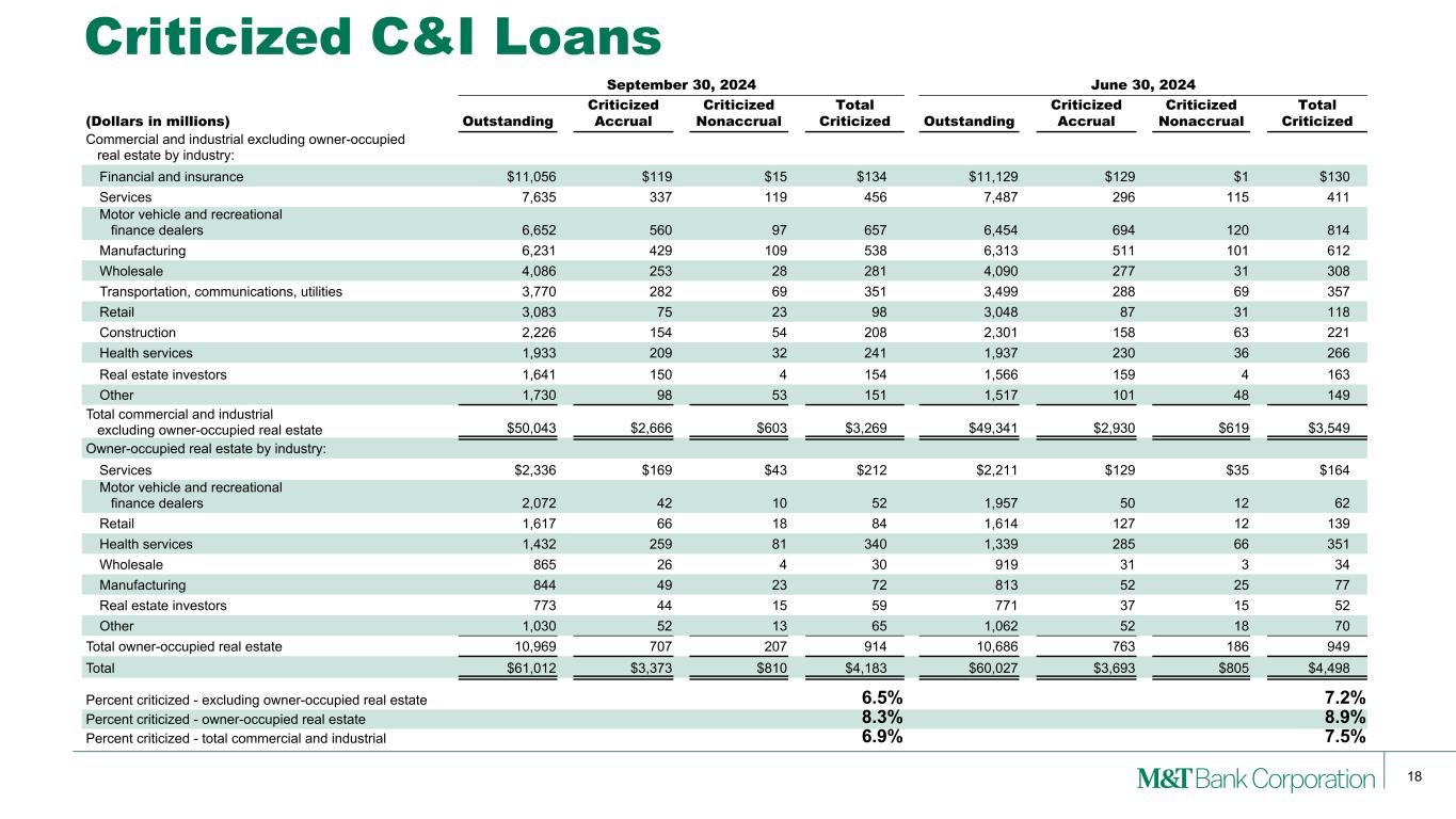 18 Criticized C&I Loans September 30, 2024 June 30, 2024 (Dollars in millions) Outstanding Criticized Accrual Criticized Nonaccrual Total Criticized Outstanding Criticized Accrual Criticized Nonaccrual Total Criticized Commercial and industrial excluding owner-occupied real estate by industry: Financial and insurance $11,056 $119 $15 $134 $11,129 $129 $1 $130 Services 7,635 337 119 456 7,487 296 115 411 Motor vehicle and recreational finance dealers 6,652 560 97 657 6,454 694 120 814 Manufacturing 6,231 429 109 538 6,313 511 101 612 Wholesale 4,086 253 28 281 4,090 277 31 308 Transportation, communications, utilities 3,770 282 69 351 3,499 288 69 357 Retail 3,083 75 23 98 3,048 87 31 118 Construction 2,226 154 54 208 2,301 158 63 221 Health services 1,933 209 32 241 1,937 230 36 266 Real estate investors 1,641 150 4 154 1,566 159 4 163 Other 1,730 98 53 151 1,517 101 48 149 Total commercial and industrial excluding owner-occupied real estate $50,043 $2,666 $603 $3,269 $49,341 $2,930 $619 $3,549 Owner-occupied real estate by industry: Services $2,336 $169 $43 $212 $2,211 $129 $35 $164 Motor vehicle and recreational finance dealers 2,072 42 10 52 1,957 50 12 62 Retail 1,617 66 18 84 1,614 127 12 139 Health services 1,432 259 81 340 1,339 285 66 351 Wholesale 865 26 4 30 919 31 3 34 Manufacturing 844 49 23 72 813 52 25 77 Real estate investors 773 44 15 59 771 37 15 52 Other 1,030 52 13 65 1,062 52 18 70 Total owner-occupied real estate 10,969 707 207 914 10,686 763 186 949 Total $61,012 $3,373 $810 $4,183 $60,027 $3,693 $805 $4,498 Percent criticized - excluding owner-occupied real estate 6.5 % 7.2 % Percent criticized - owner-occupied real estate 8.3 % 8.9 % Percent criticized - total commercial and industrial 6.9 % 7.5 %